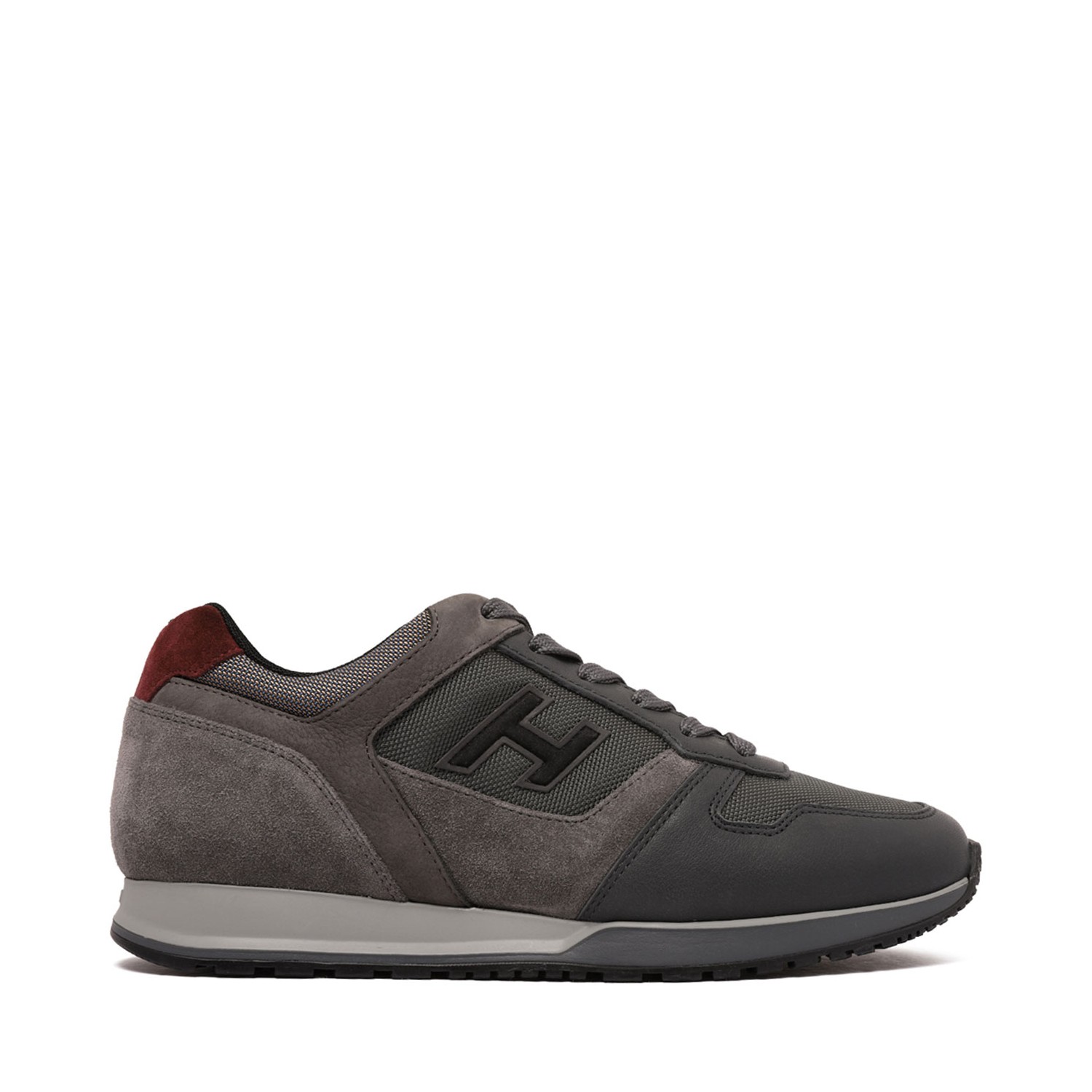 Hogan Grey Panelled-Leather Sneakers. Grey leather panelled design sneakers with front lace-up fastening, flat rubber sole, logo patch to the side.