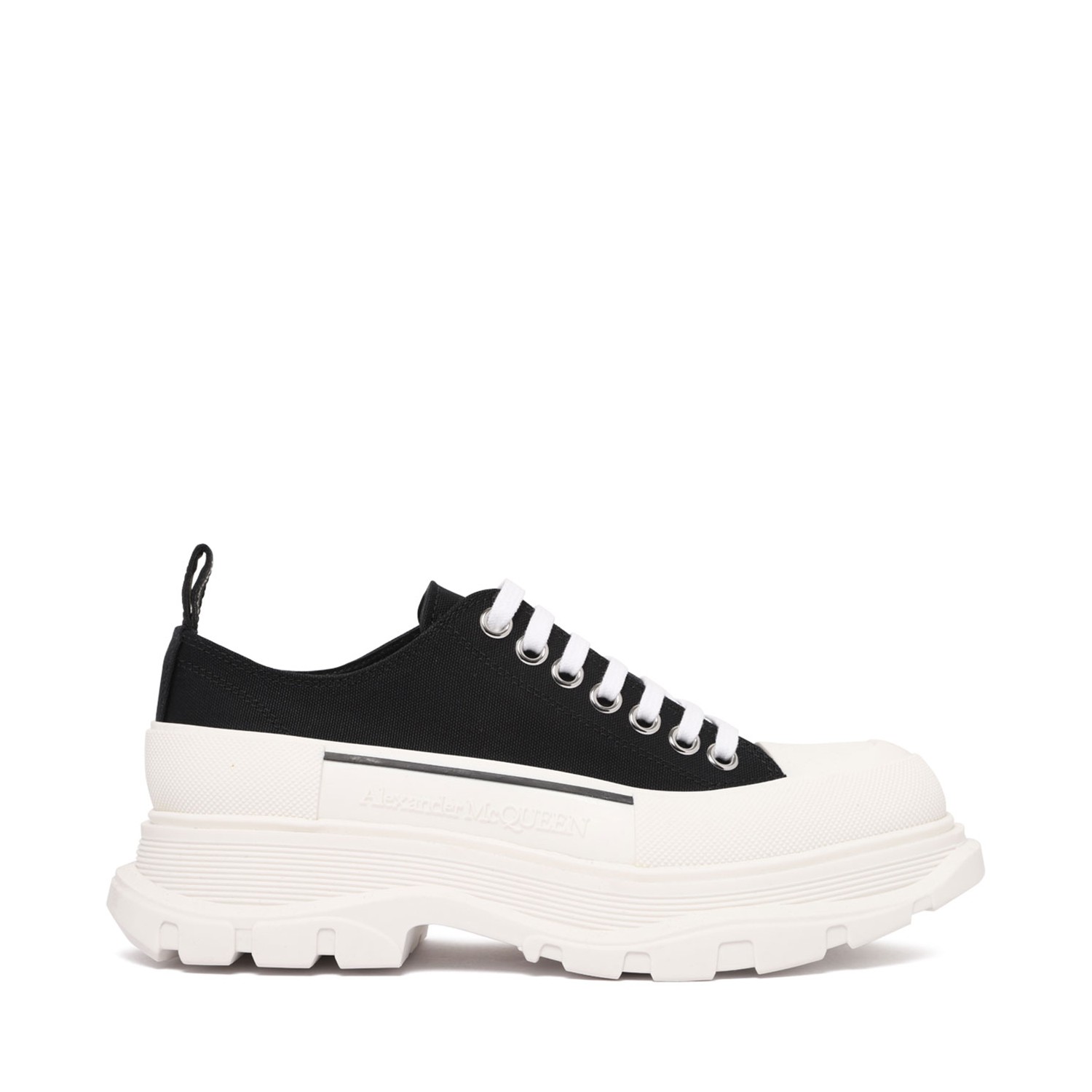 Alexander McQueen Tread Slick Sneakers. Black and white sneakers with front lace-up fastening, pull-tab at the heel. Embossed logo to the side, chunky rubber sole.