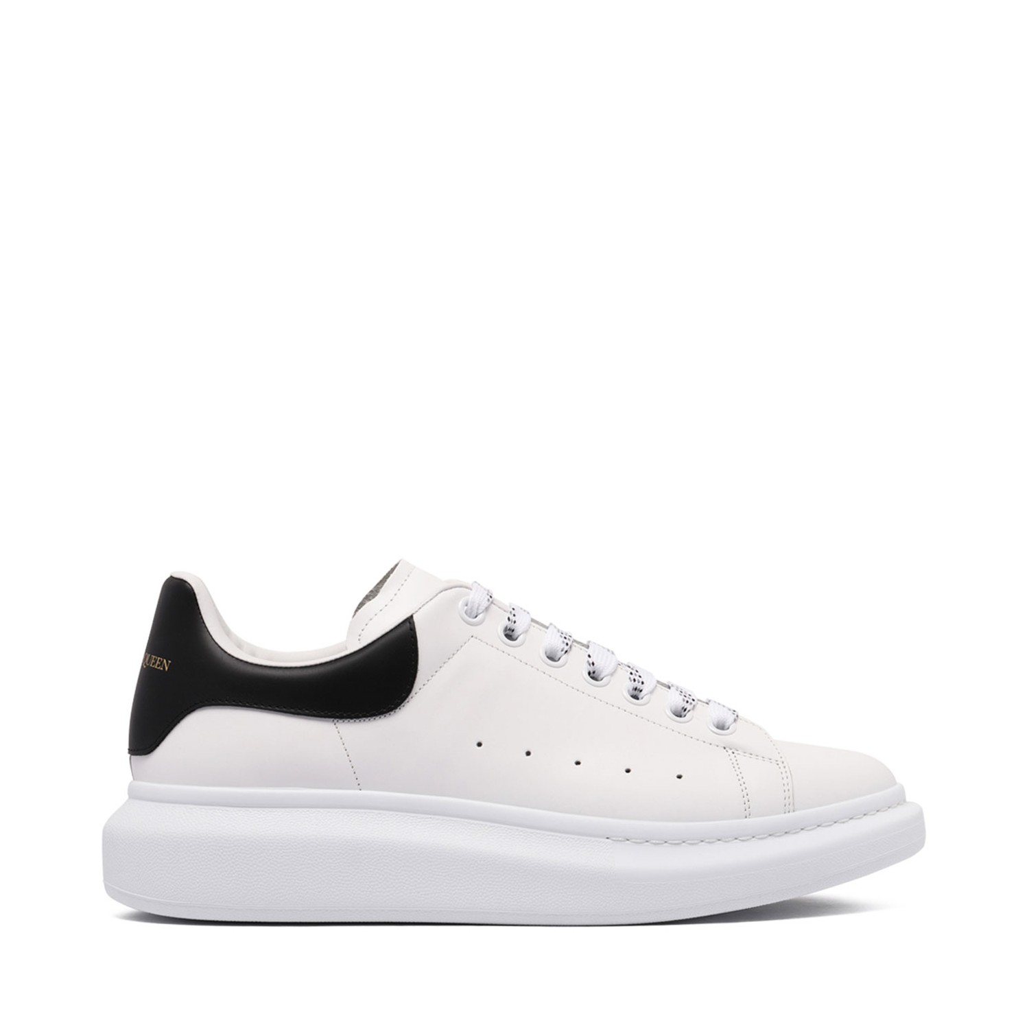 Alexander McQueen White and Black Oversize Sneakers. White and black calfskin sneakers with front lace-up, wide flat laces. Round toe, black leather detail on the heel. Low cut collar, gold Alexander McQueen signature on tongue and heel. Leather interior and insole. Oversized white rubber sole.