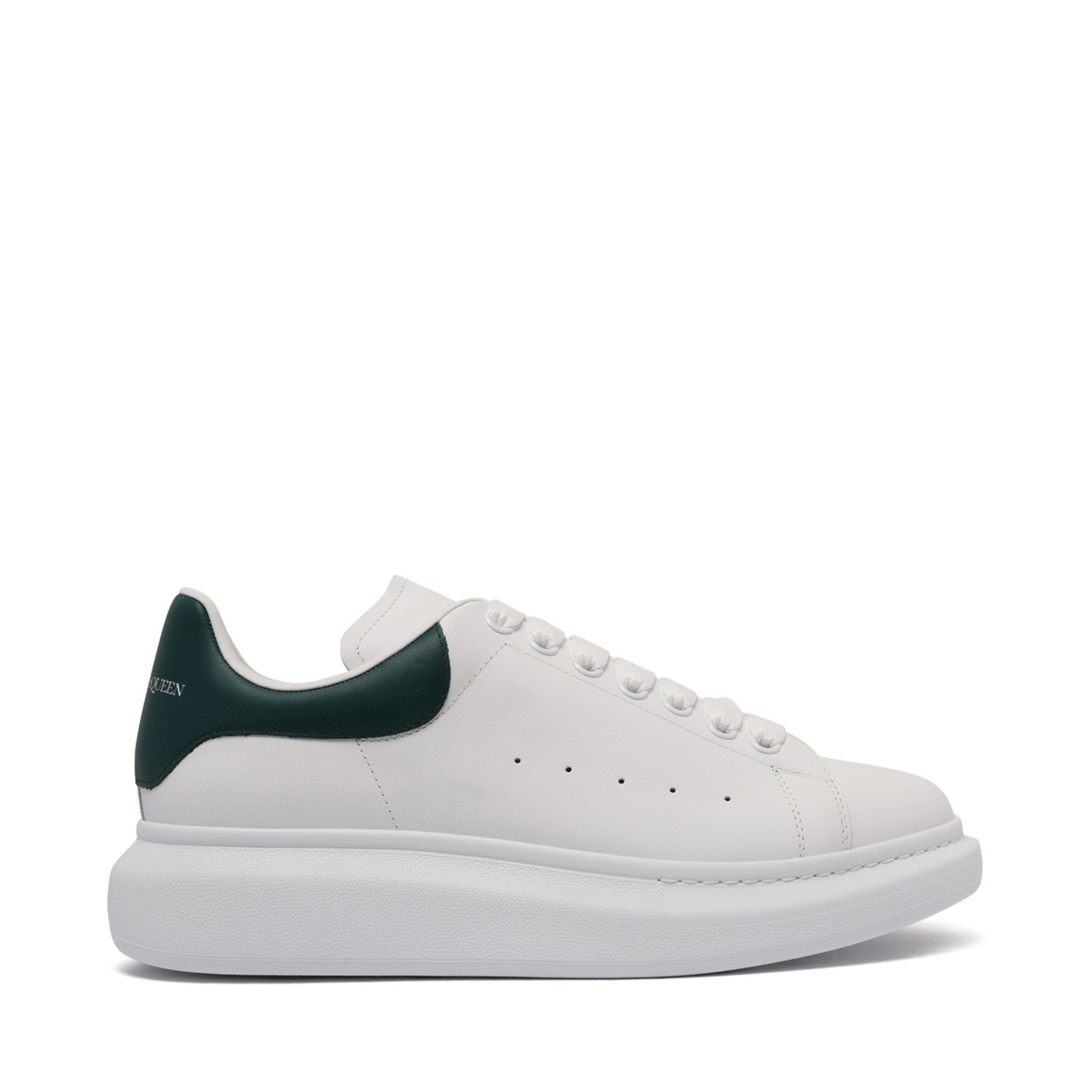 Alexander McQueen White and Green Oversized Sneaker. White and green calf leather oversized sneakers with a phthalo green heel counter featuring the McQueen signature. Finished with a chunky rubber sole.