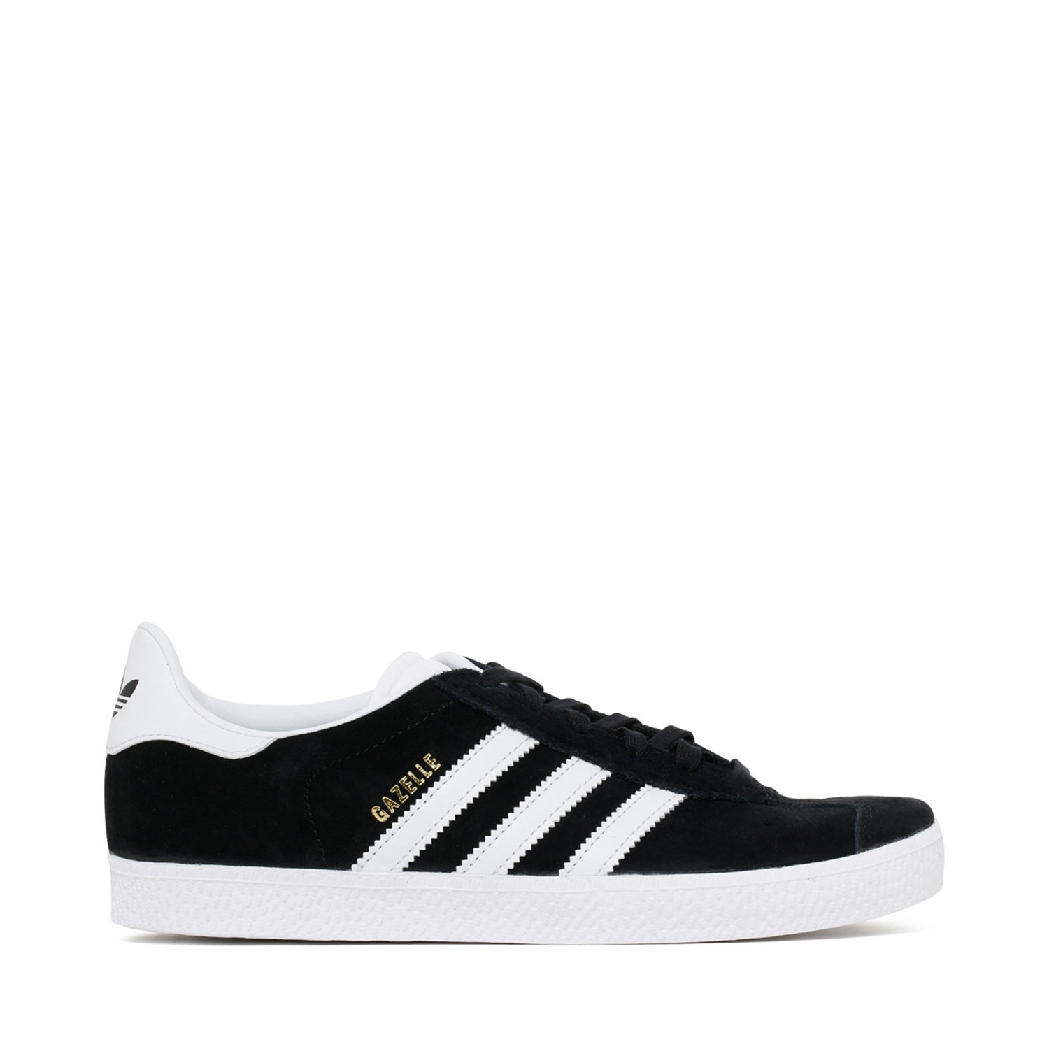 Adidas Black Gazelle Sneakers. Black suede and leather low top sneakers, front laces up fastening,. Trefoil logo on the tongue and heel reinforcement, leather lining.
