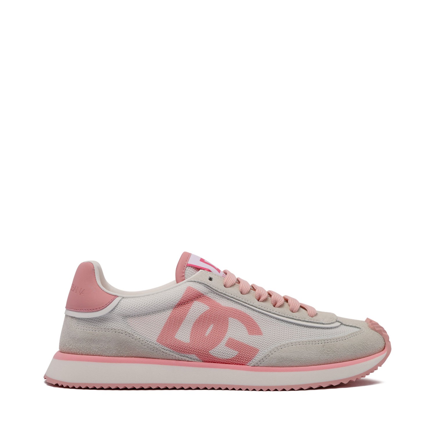 Dolce & Gabbana DG Cushion Sneakers. White and pink leather sneakers, front lace up fastening, logo patch at the tongue. Branded leather insole, flat rubber sole.
