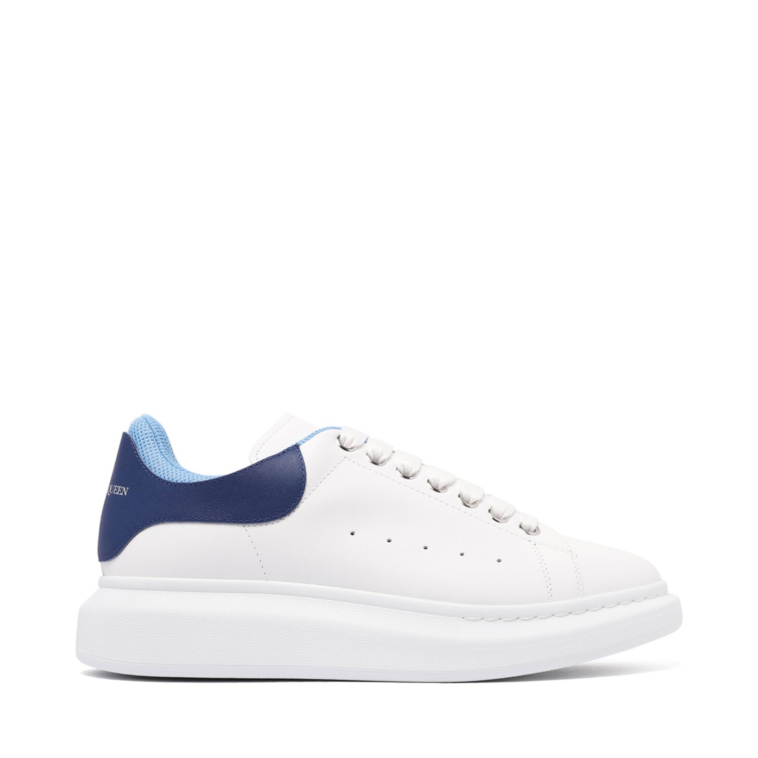 Alexander McQueen White and Blue Leather Sneakers. White and blue leather sneakers with padded ankle, front lace-up fastening. Perforated detailing, round toe and rubber sole.