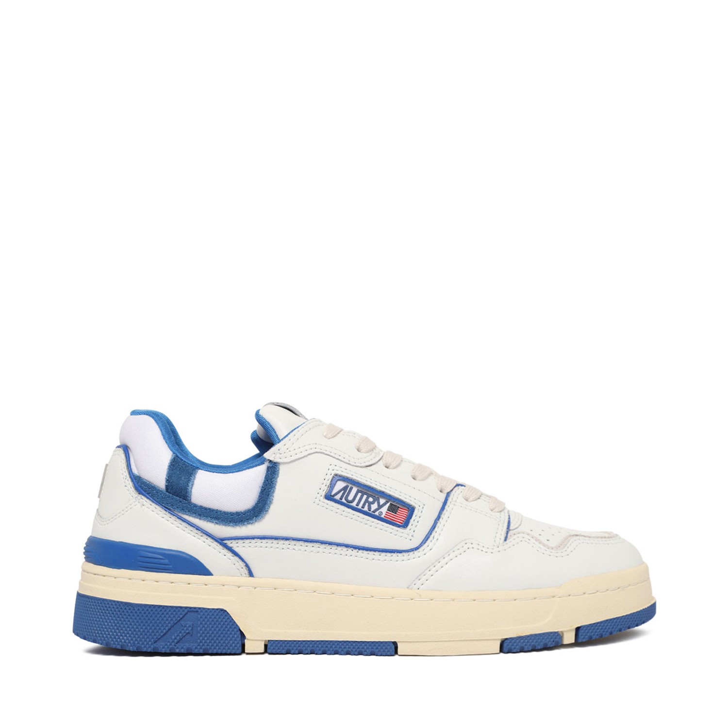 Autry White and Blue CLC Sneakers. White and blue leather sneakers, smooth grain, multi-panel design, embossed logo to the rear, logo patch at the tongue. Embroidered logo to the side, perforated toebox, branded insole, round toe, front lace-up fastening, flat rubber sole.