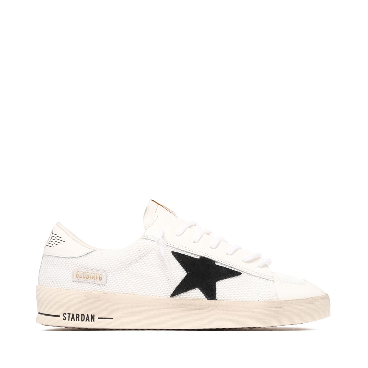 Golden Goose White and Black Stardan Sneakers. White and black calf letaher-cotton blend sneakers, applique logo, signature star patch to the sides. Logo print to the rear, round toe, front lace-up fastening. Logo patch at the tongue, branded insole, rubber sole.