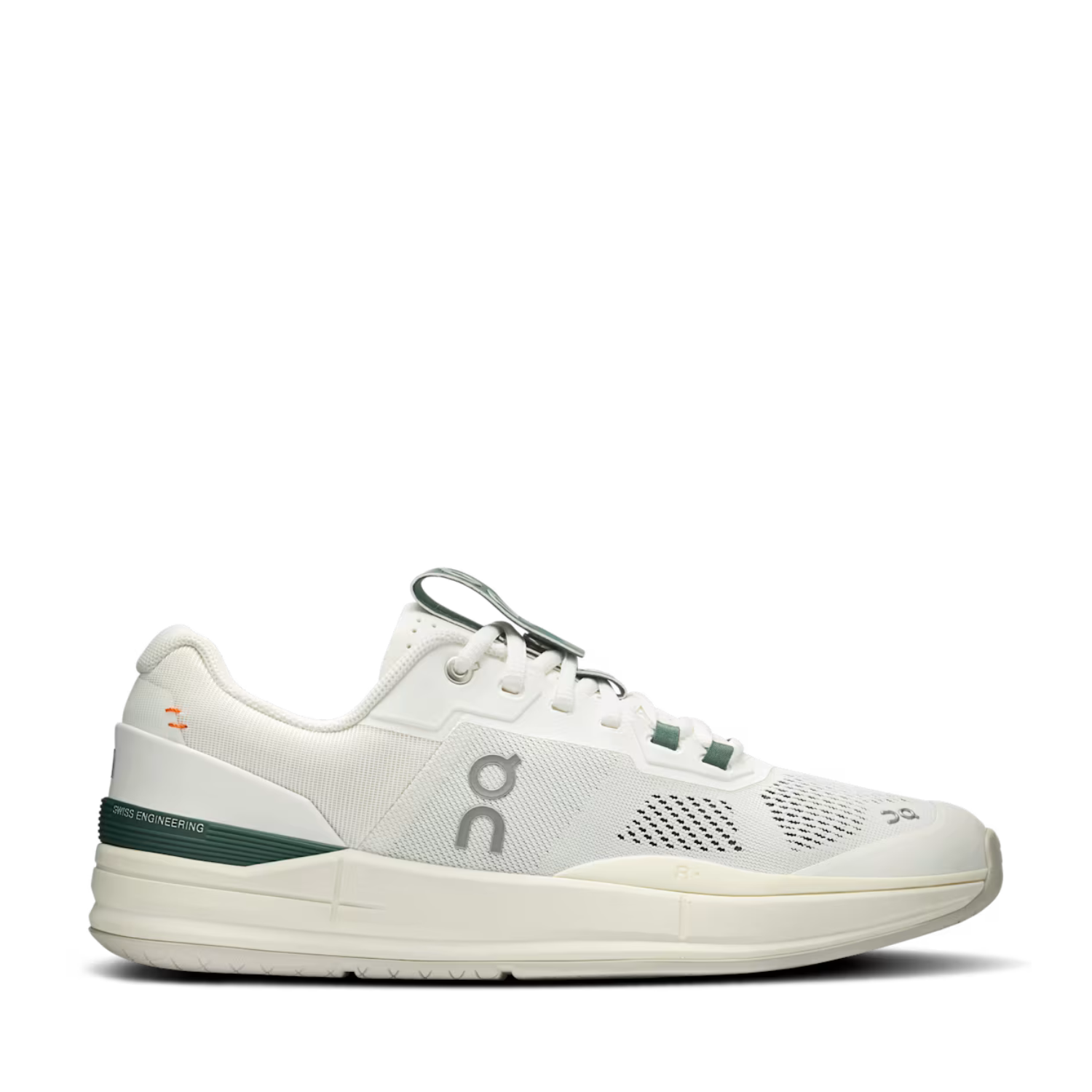 On Shoes White Evergreen The Roger Pro Sneakers. White evergreen low top sneakers with technical mesh to ensure breathability and support, lateral and medial support for snappy lateral movements. Padded heel for maximum comfort and support, midfoot cage to stabilize the foot.