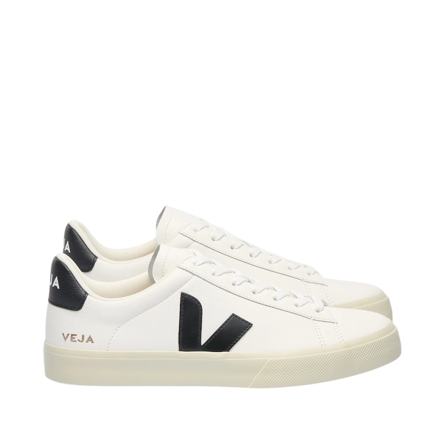 Veja White and Black Campo Leather Sneakers. White and black leather sneakers with pebbled texture, suede trim, round toe, logo-debossed tongue. Logo patch to the side, logo print to the side, contrasting branded heel counter. Branded insole, flat rubber sole and front lace-up fastening.