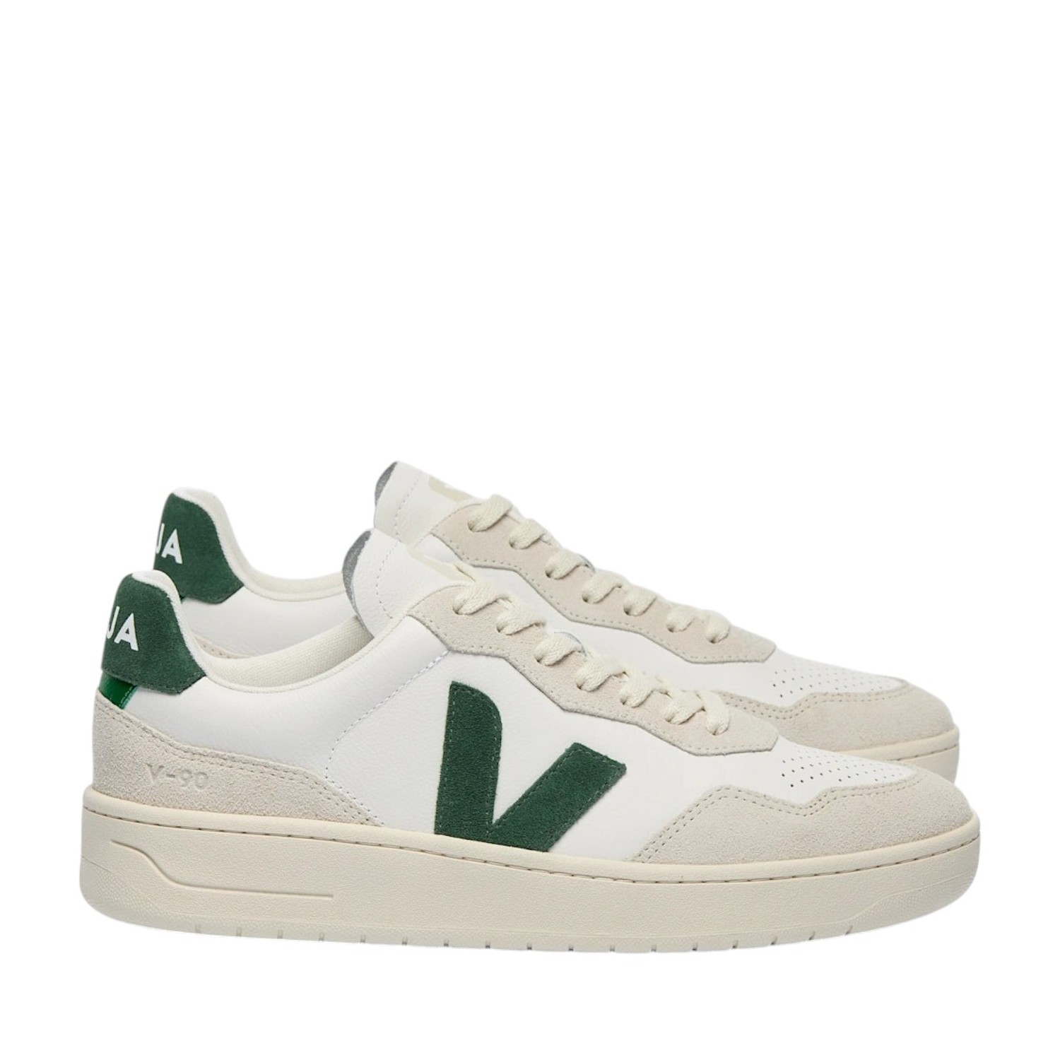 Veja White and Green V-90 Leather Sneakers. White and green calf leather low top sneakers with logo patch to the side, perforated detailing, logo patch at the tongue, round toe. Front lace-up fastening, branded insole, flat rubber sole.