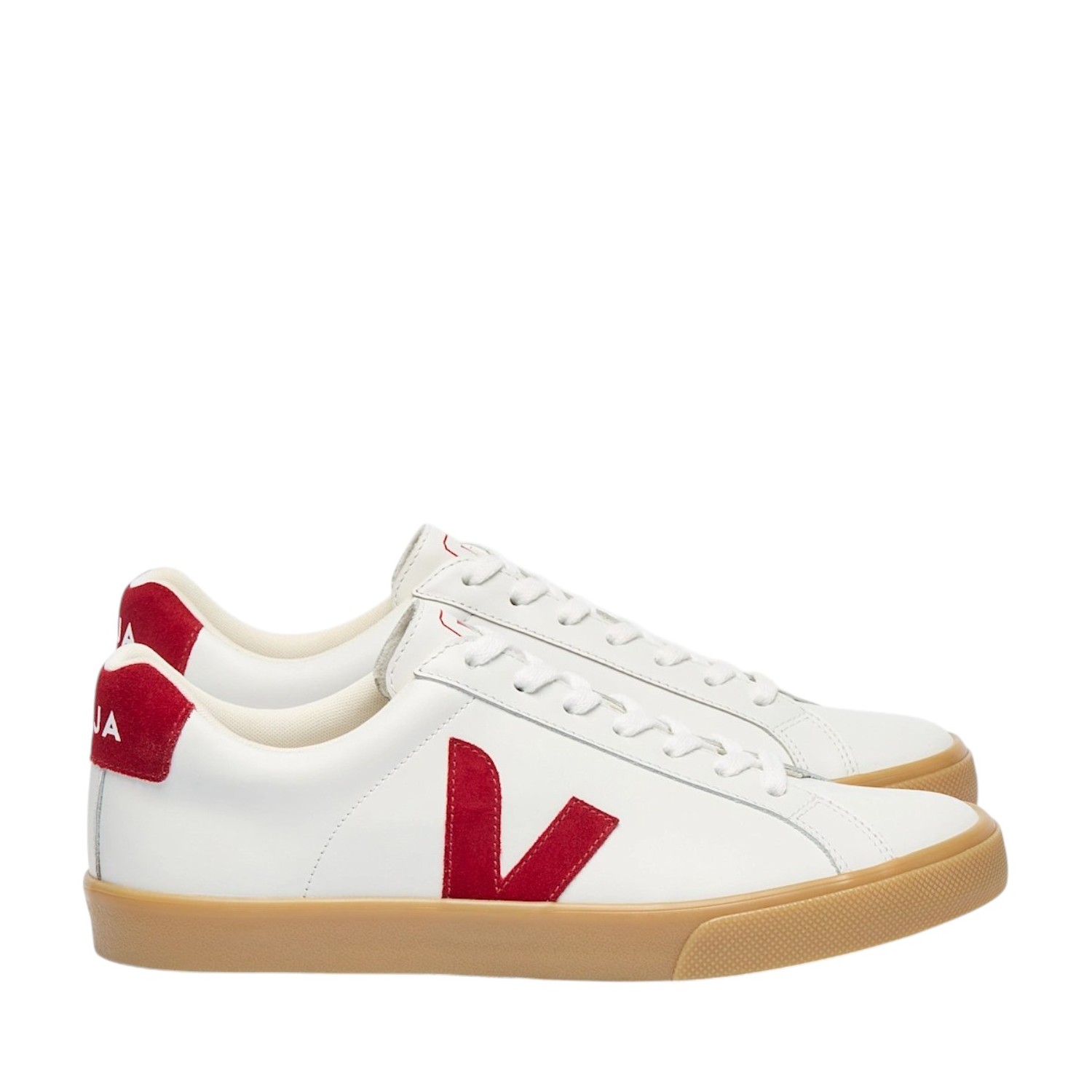 Veja White and Pepper Natural Esplar Leather Sneakers. White and pepper natural leather sneakers with front lace-up fastening, contrasting branded heel counter, logo patch to the side, flat rubber sole.