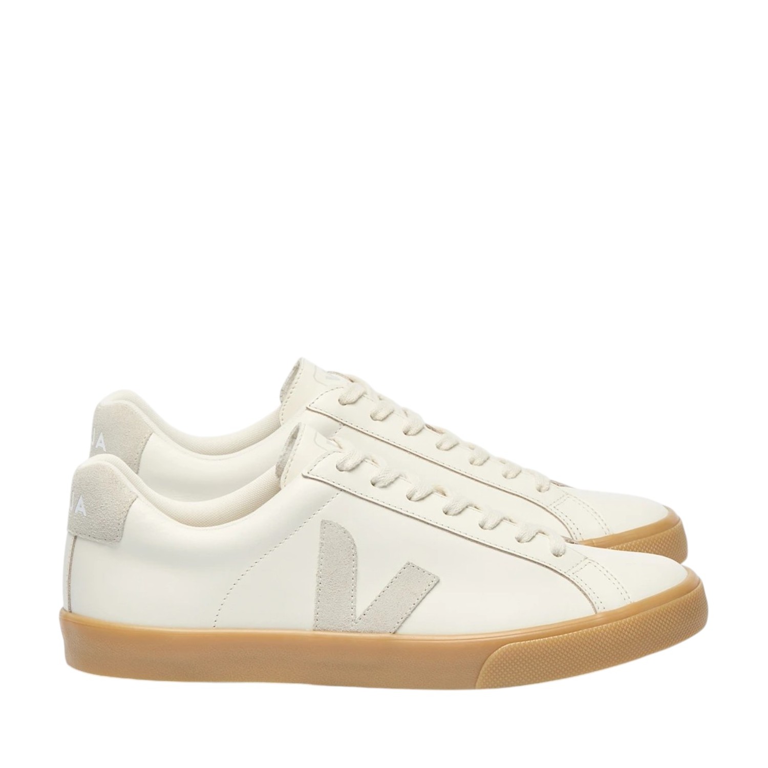 Veja Pure Natural Esplar Leather Sneakers. Pure natural leather sneakers with front lace-up fastening, contrasting branded heel counter, logo patch to the side, flat rubber sole.