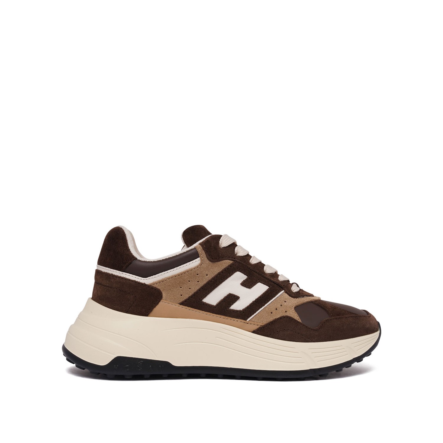 Hogan Beige and Brown Hi-Fi Sneakers. Beige and brown leather sneakers with suede upper, mesh fabric and metallic leather inserts. H carved side, glitter fabric and nappa details. 8mm memory foam insole and rubber sole.