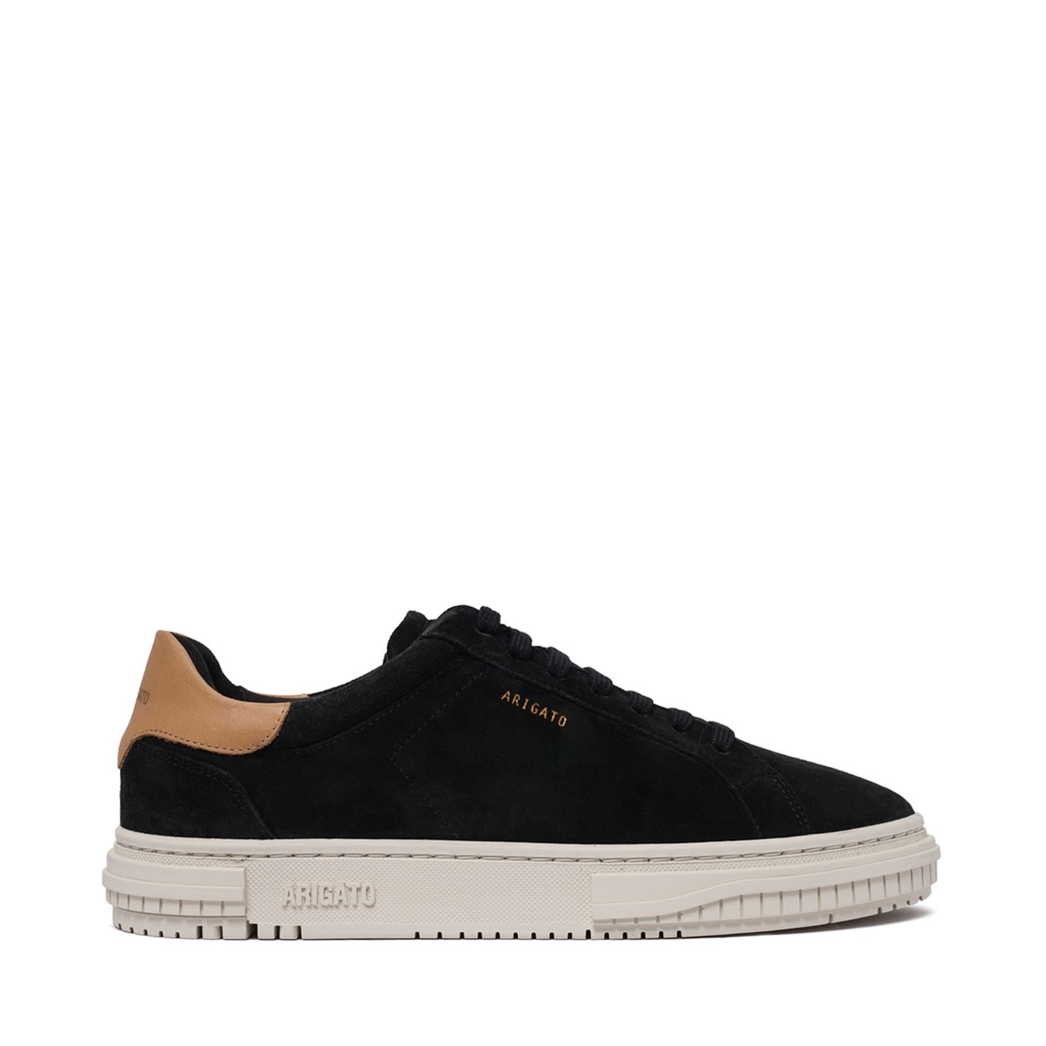 Axel Arigato Black Atlas Sneakers. Black leather low top sneakers with logo stamp in metallic gold, flat cotton laces.