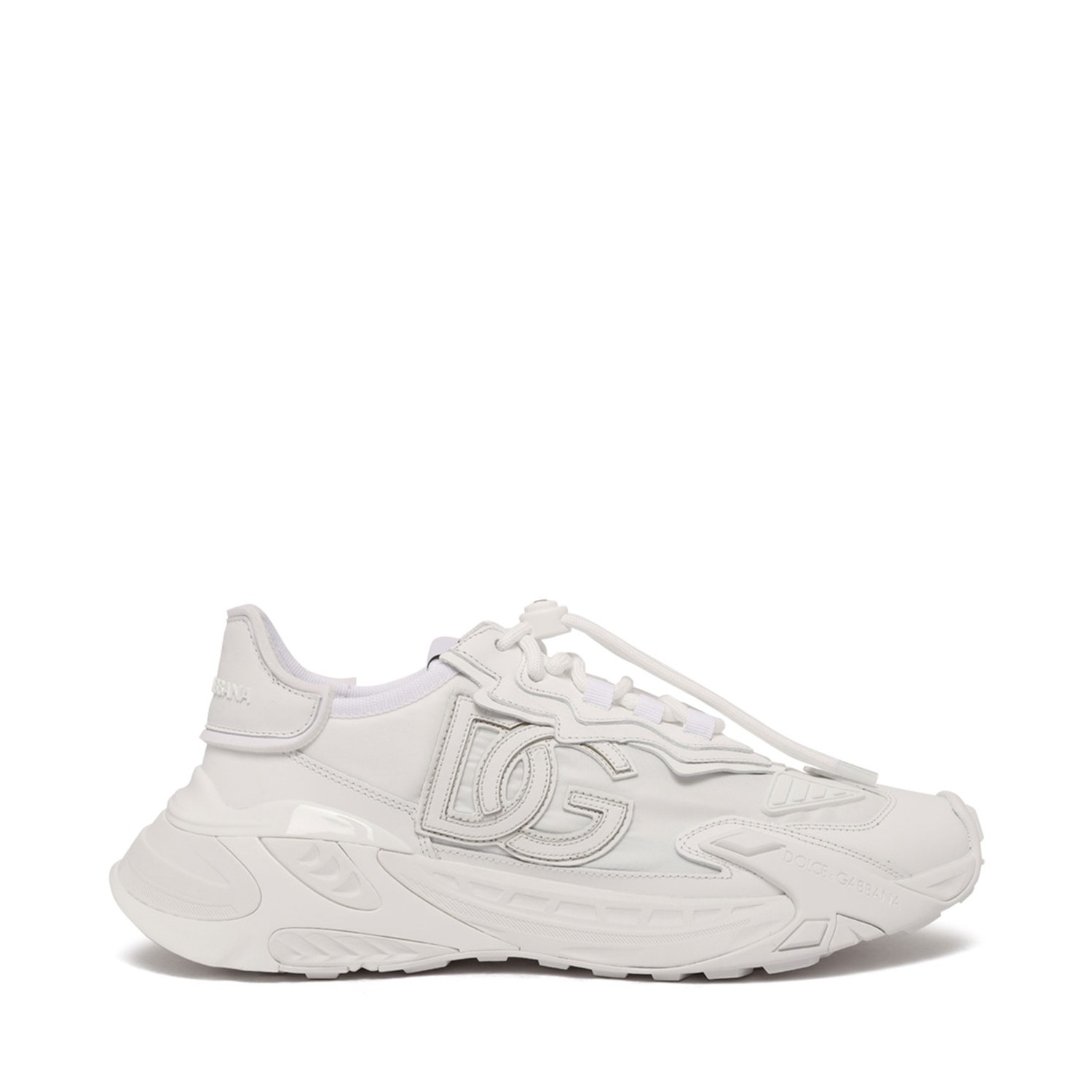 Dolce & Gabbana White Logo-Patch Panelled Sneakers. White panelled sneakers with logo patch to the side, front lace-up design and chunky rubber sole.
