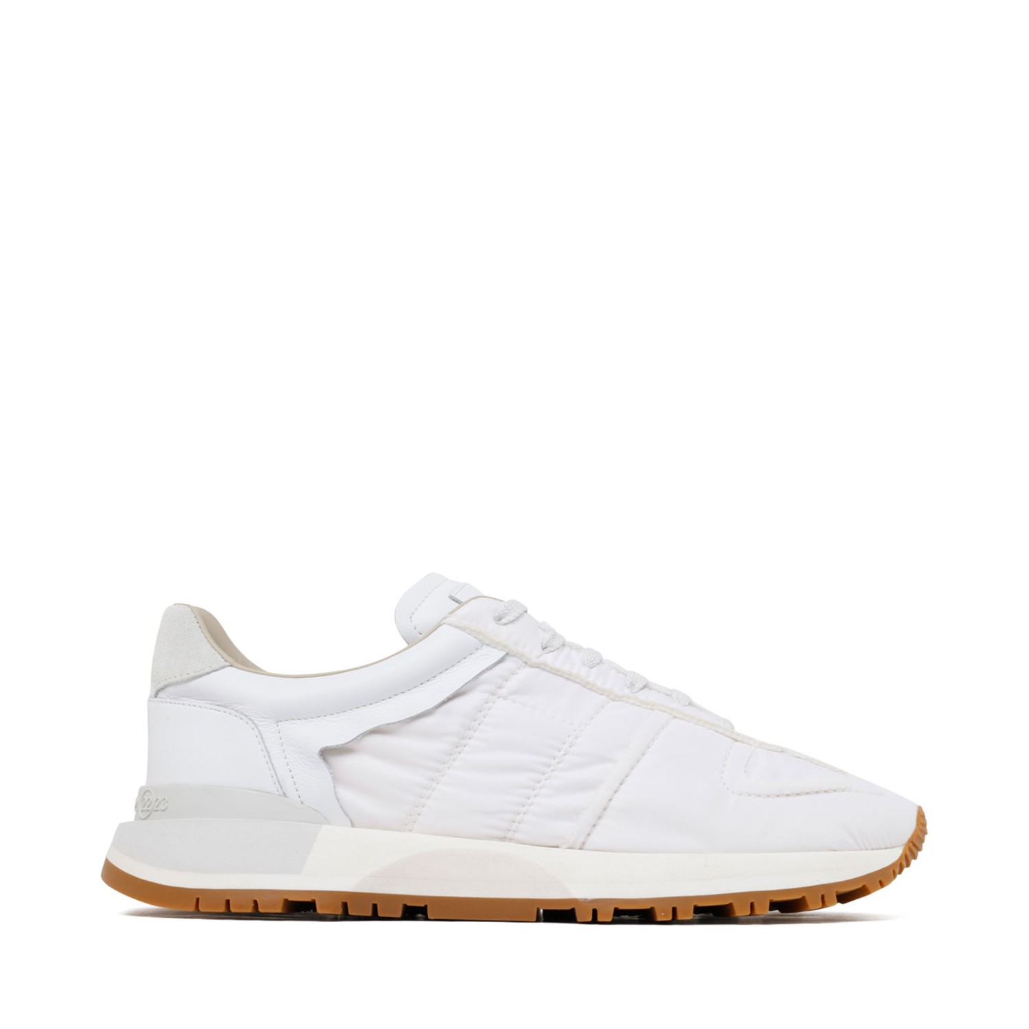 Maison Margiela White Leather Low Top Sneakers. White leather sneakers, front lace up fastening, logo print at the tongue, round toe, flat rubber sole.