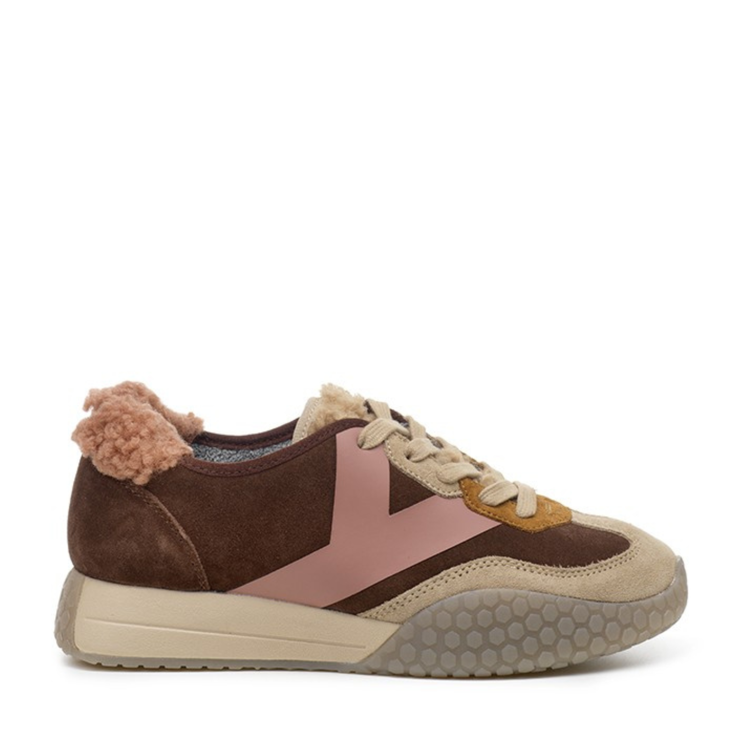 Keh Noo Nut and Brown KW 9743 Sneakers. Contemporary vintage trainer in cow suede leather upper, with eco-fur tongue and collar. Cotton laces, rubber outsole, with cushioned EVA midsole. Towel fabric lining, removable super-soft foam insole, mesh lined.