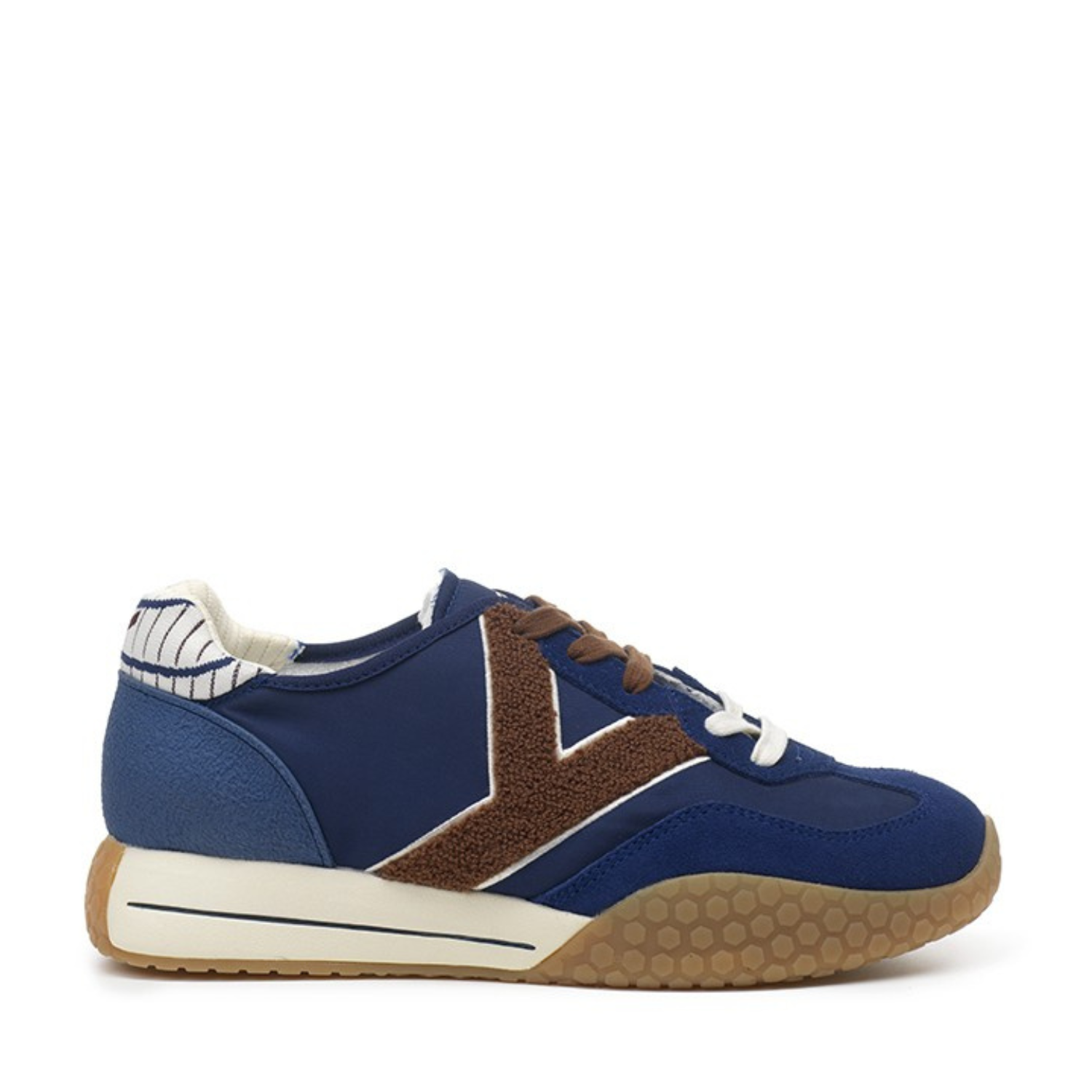 Keh Noo Blue and Brick KM 9777 Sneakers. Contemporary vintage trainer in padded nylon upper, with raw-cut tongue. Suede leather toe and eyestay. Rubber back heel, double cotton laces, rubber outsole, with cushioned EVA midsole. Towel fabric lining, removable super-soft foam insole, mesh lined.