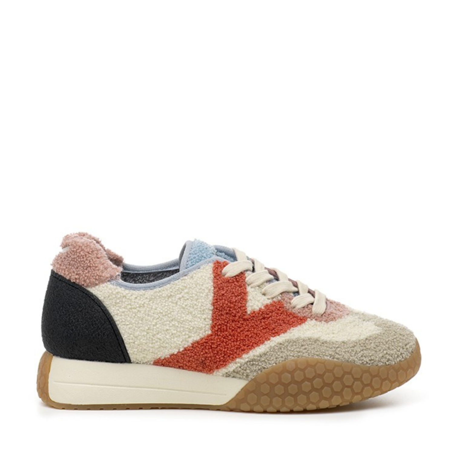 Keh Noo White and Pink KW 9724 Sneakers. Contemporary vintage trainer with flocked fabric upper, rubber back heel, cotton laces. Rubber outsole, with cushioned EVA midsole, towel fabric lining. Removable super-soft foam insole, mesh lined.