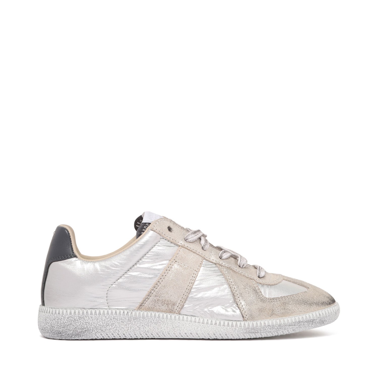 Maison Margiela Replica Iridescent Sneakers. The Replica Iridescent sneakers are crafted from soft calfskin and glittery suede with a glossy finish and an iridescent coating that reflects colorful hues in the light. The Maison's iconic Replica sneakers are inspired by Austrian sports shoes from the 1970s. The details of the Replica models are constantly updated to reflect the season's inspirations.