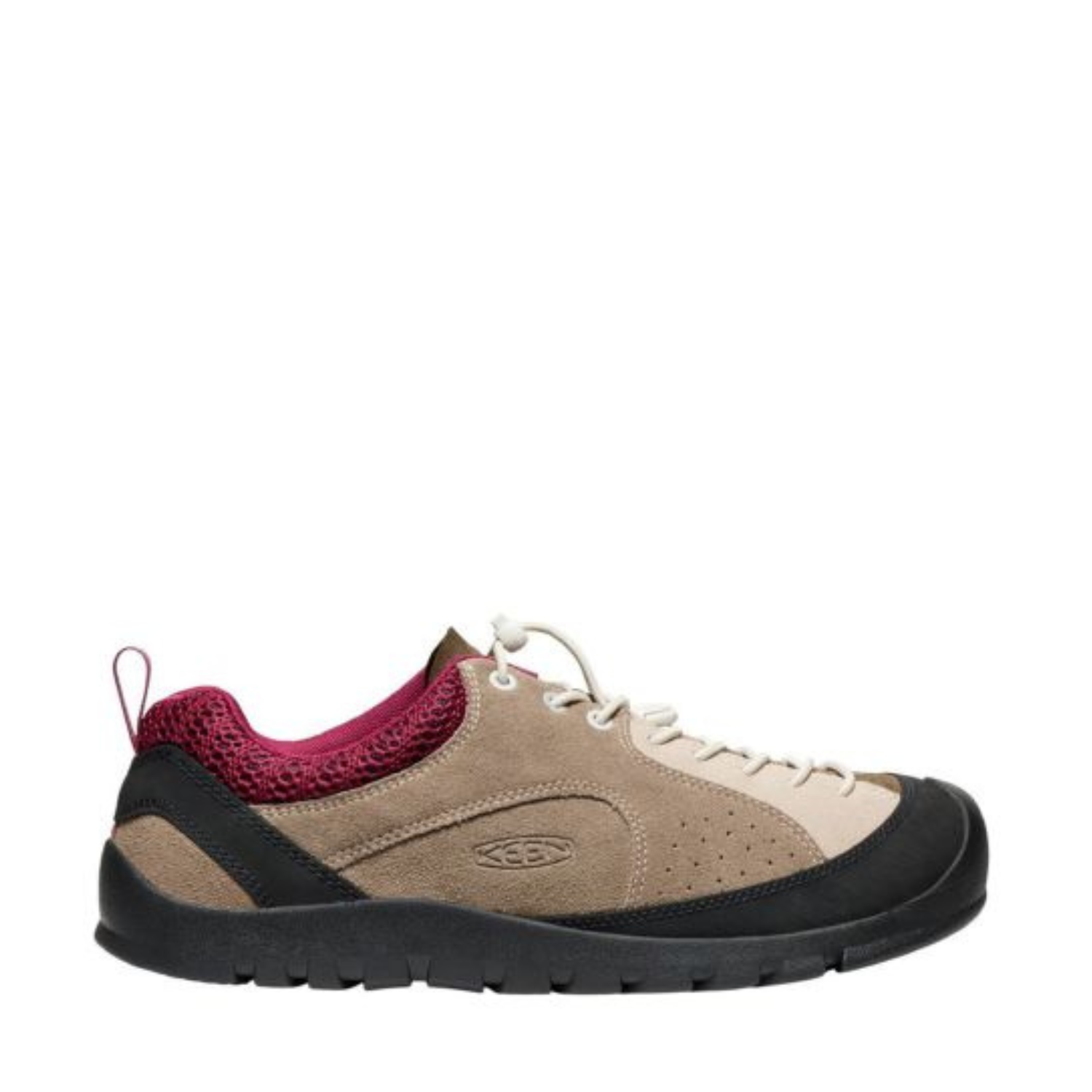 Keen Taupe Jasper Rocks Shoes. Taupe shoes with a tongue-to-toe lacing system and a protective yet flexible rubber outsole. In the 'Rocks' version, the cork footbed and cushioning around the ankle ensure extreme comfort, while the bungee laces make it easy to tie.