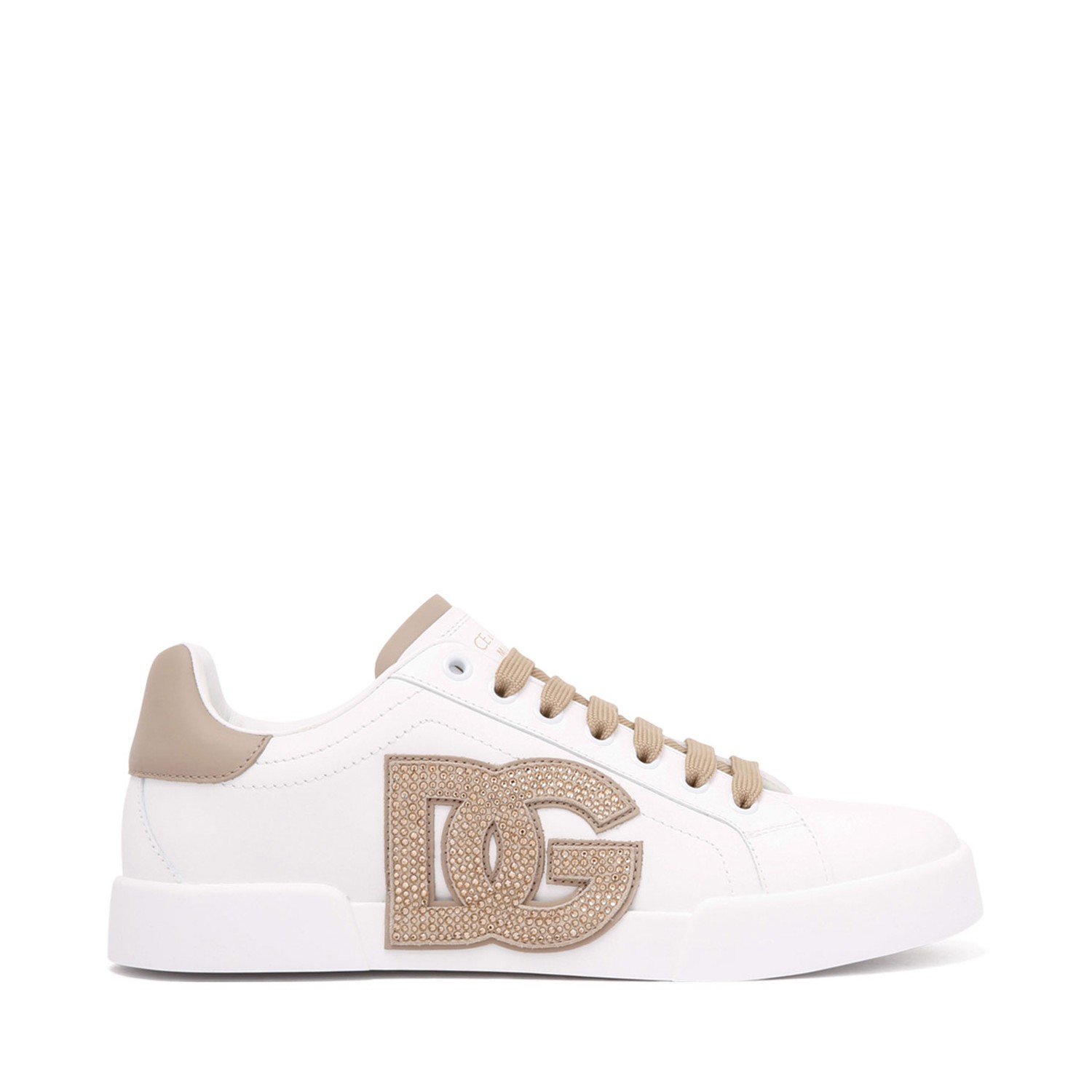 Dolce & Gabbana White Portofino Logo Embellished Sneakers. White calf leather sneakers with logo embellished to the side, fron lace-up fastening, padded ankle collar, rubber outsole.