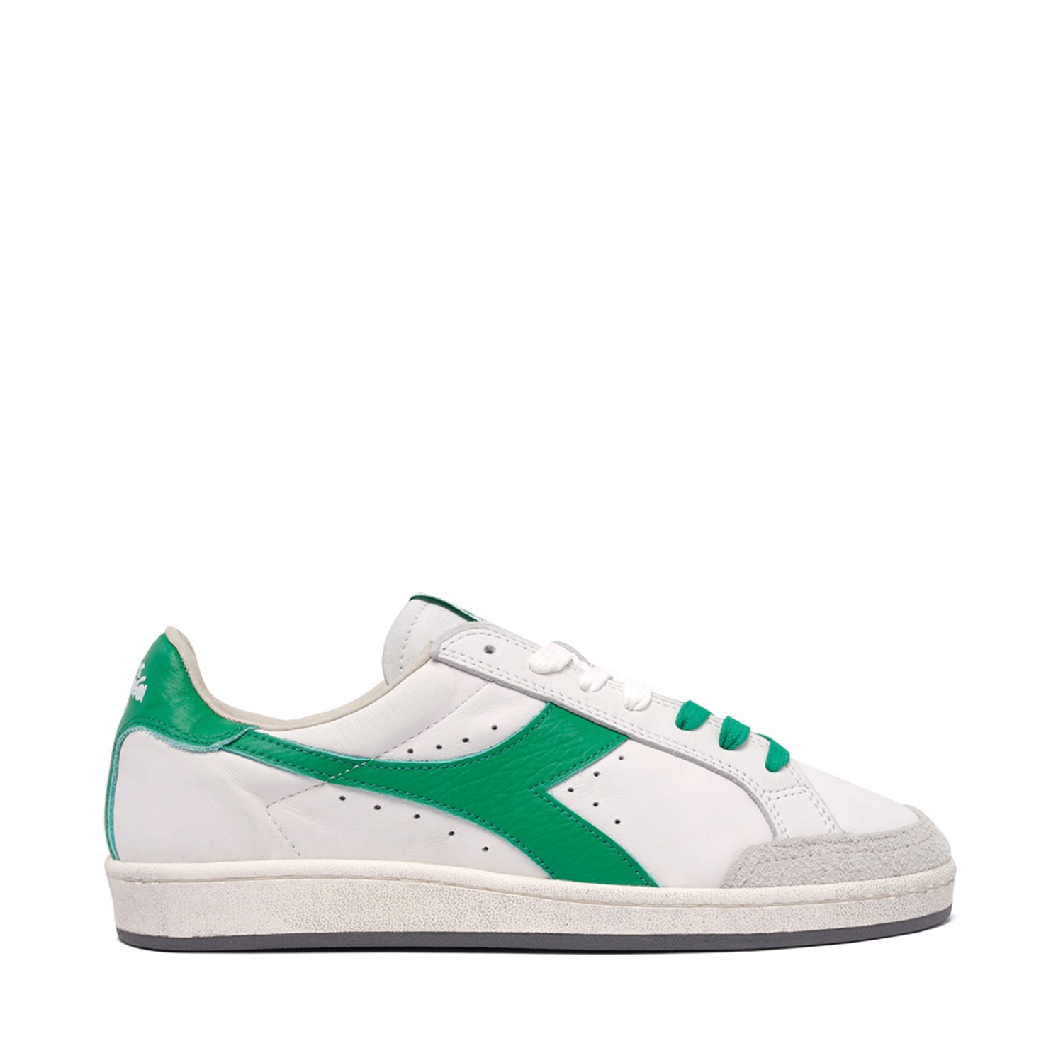 Diadora White and Green Leather Low Top Sneakers. White and green leather low top sneakers with front lace up fastening, logo print to the real and at the tongue.