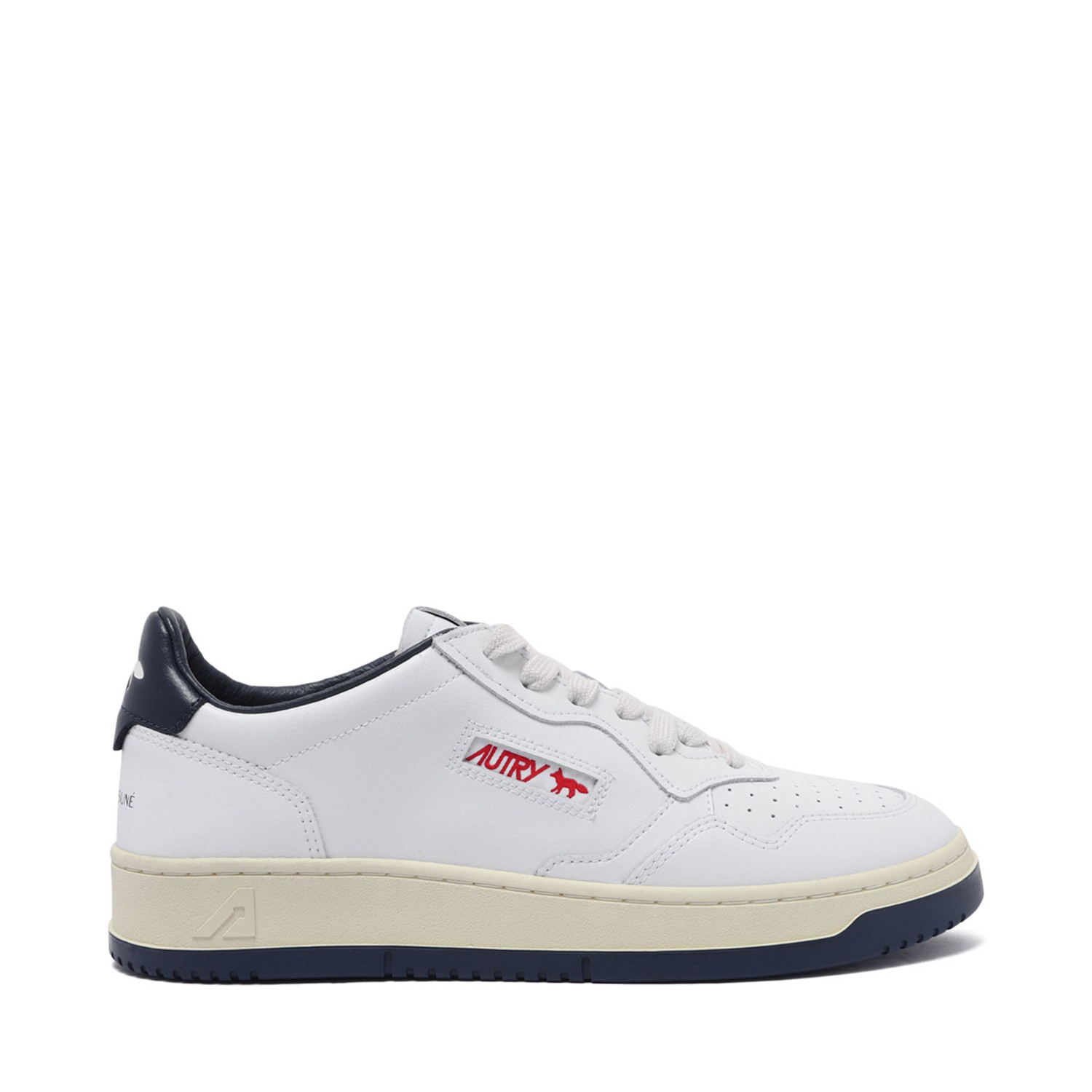 Autry X Maison Kitsune White and Blue Medalist Sneakers. Sneakers in smooth white leather with perforated detail on the toe, featuring a lace-up closure, round toe, leather and fabric lining, and rubber sole. The design is completed by a logo label on the tongue, a logo label on the side, and a blue leather heel counter with embossed logo.