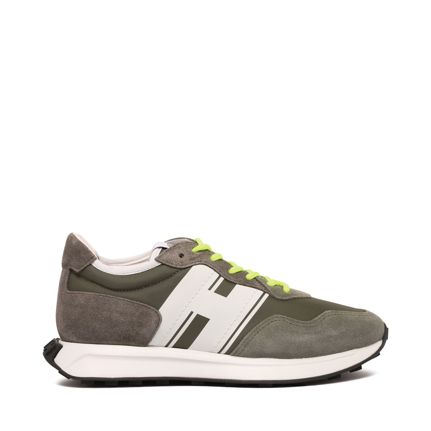 Hogan H601 Sneakers. Khaki, white and fluorescent yellow calf suede/calf leather sneakers with logo print to the side and logo patch at the tongue. Panelled design, round toe, front lace-up fastening, contrasting laces ,branded insole and flat rubber sole.