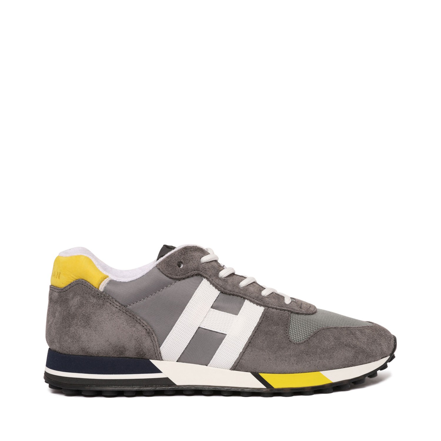 Hogan Grey Panelled Suede Sneakers. Crafted from soft suede in a grey-hued panelled design, these sneakers from Hogan are adorned with bright yellow touches. The signature H offers an instantly recognisable look to the low-top pair.