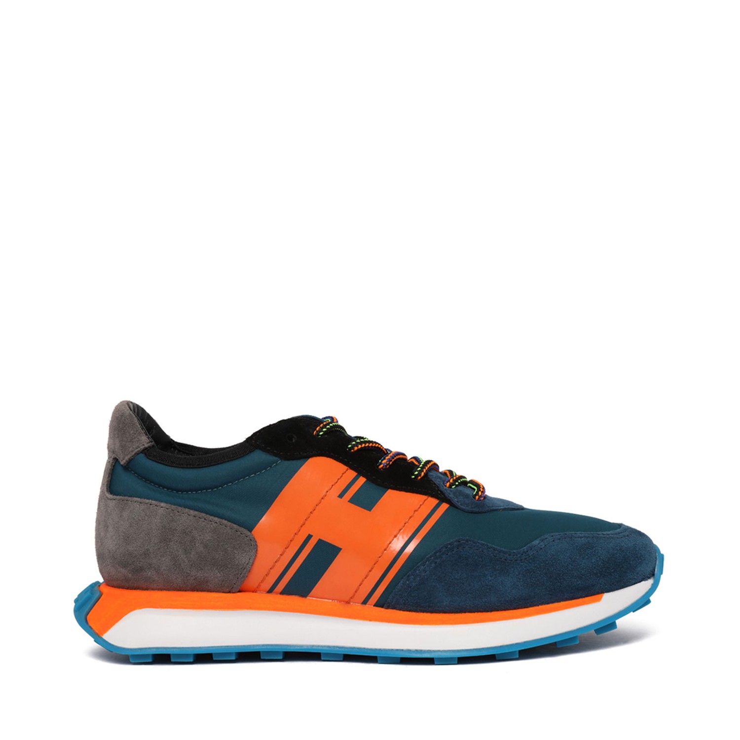 Hogan Electric Blue and Multicolour Logo Print Sneakers. Electric blue and multicolour calf suede sneakers with panelled design, logo print to the side. Branded insole, round toe, front lace-up fastening and flat rubber sole.