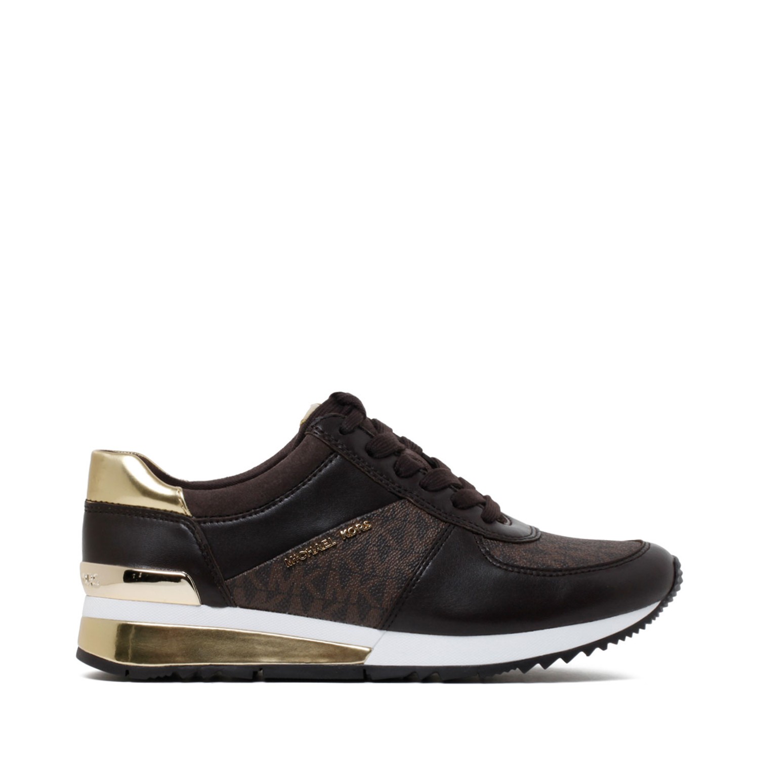 Michael Kors Brown Allie Sneakers. Brown leather sneakers, suede contrast panel, front lace up fastening, logo at the tongue. All over monogram pattern, round toe, branded insole.
