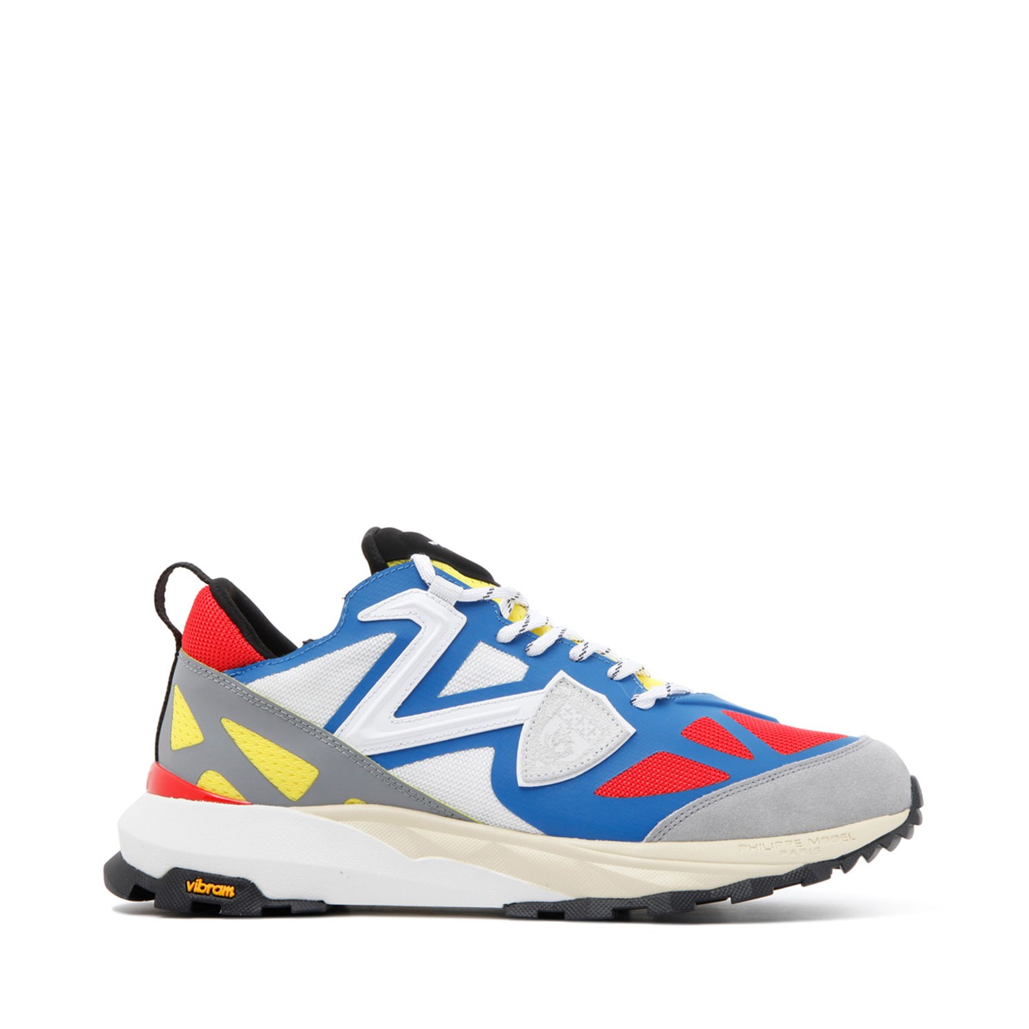 Philippe Model Paris White and Multicolour Panelled Low Top Sneakers. White and multicolour low top sneakers, front lace up fastening, logo patch to the side, panelled design. Mesh detailing, logo debossed tongue, pull tab at the heel, round toe, rubber sole.