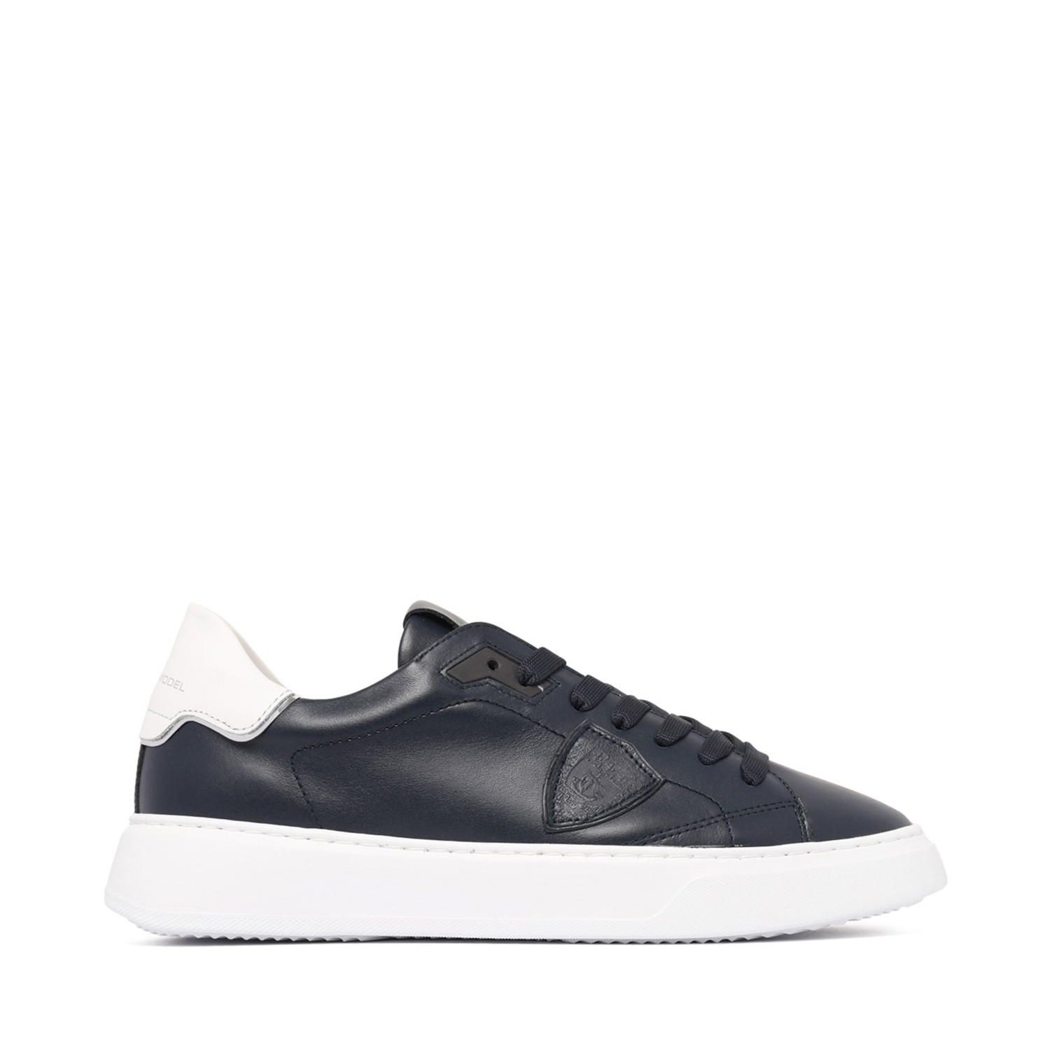 Philippe Model Blue Temple Sneaker. Blue calf leather sneaker. Calfskin sneaker with contrasting top and silver piping. Cotton terry lining, removable memory foam insole with breathable technical fabric and ultra-light rubber sole with handcrafted finish. Heel height 4 cm.