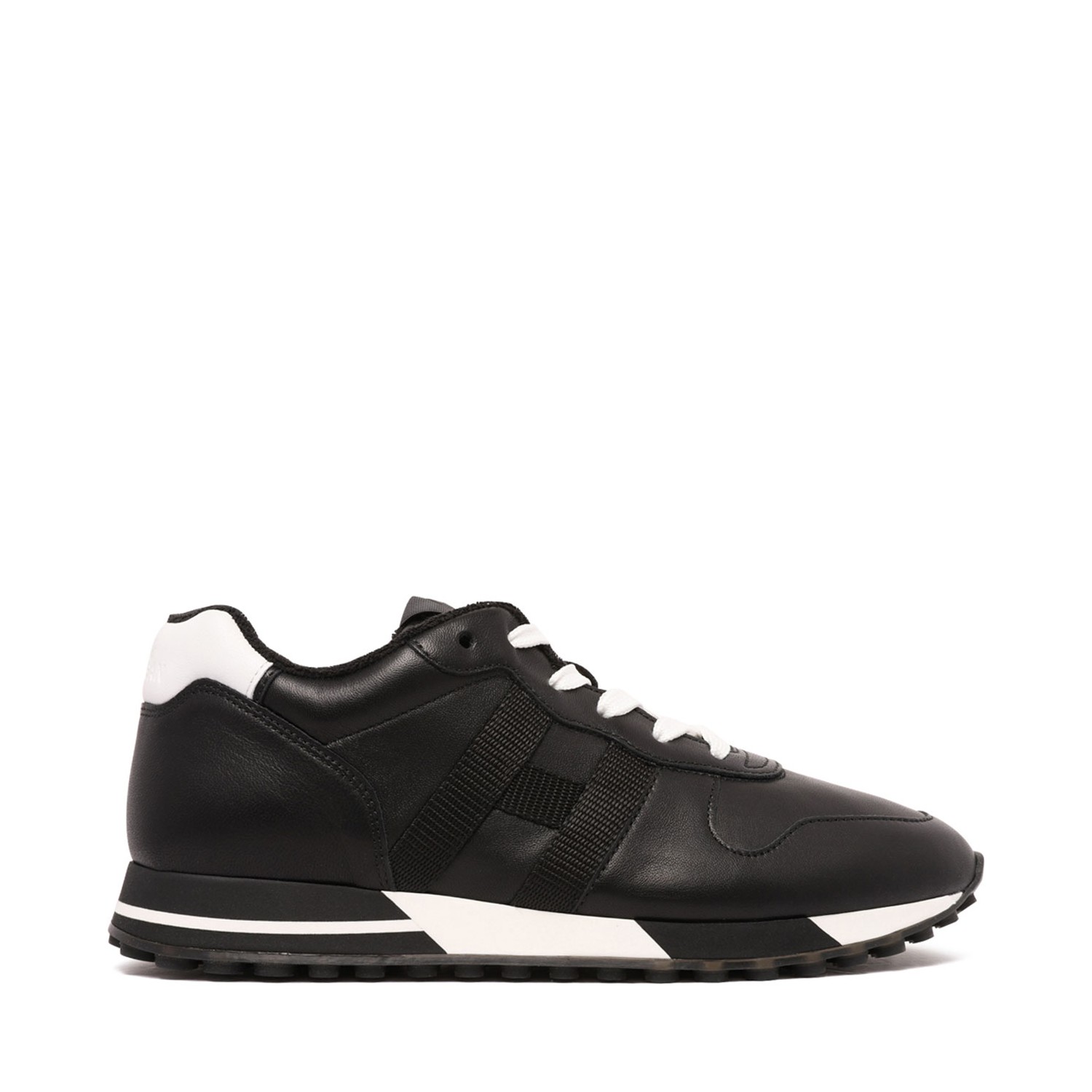 Hogan Black H838 Low-Top Sneakers. Black leather H838 low-top trainers from Hogan featuring stitched panels, a logo to the outside, a contrasting heel counter, a brand embossed tongue, a lace fastening, a round toe and a ridged rubber sole.