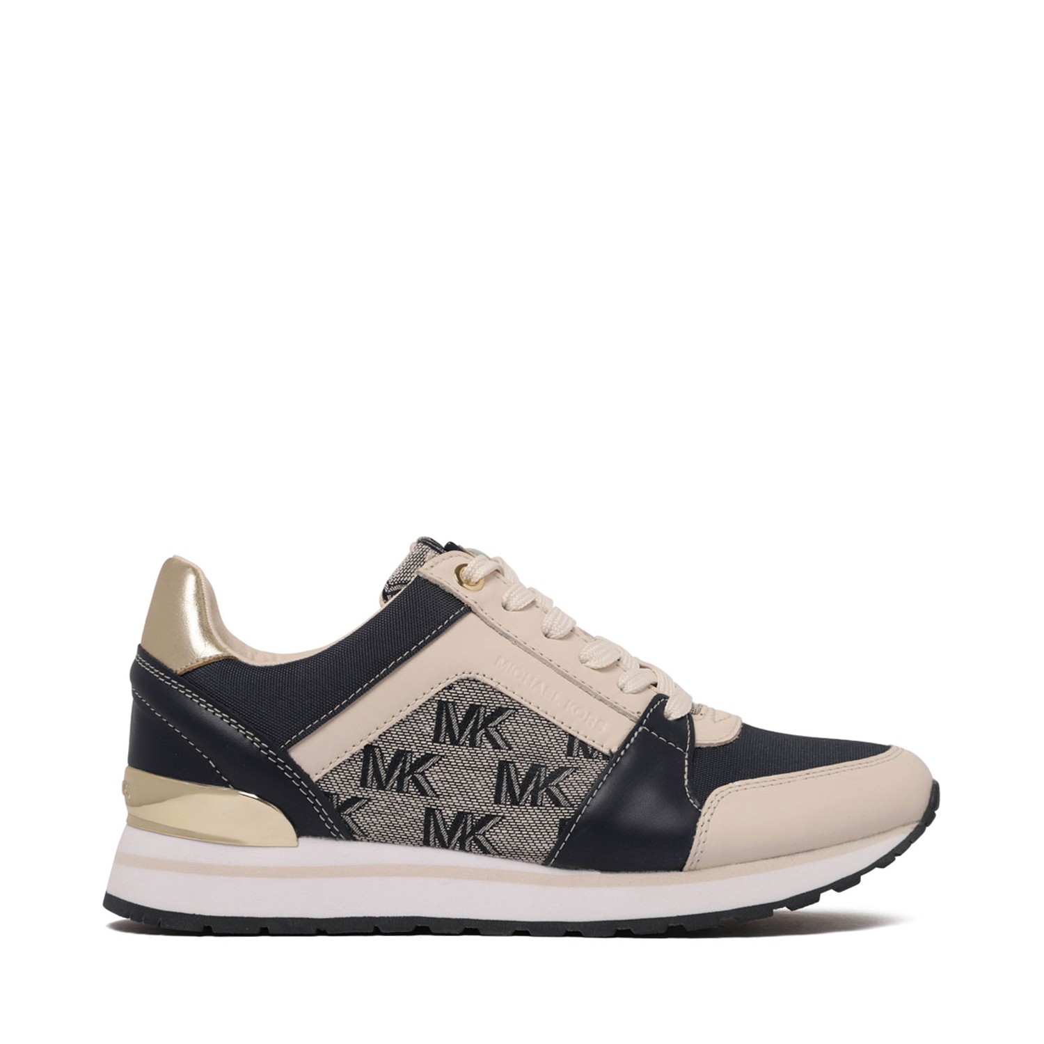 Michael Kors Billie Monogram-Print Sneakers. Navy blue and off white sneakers with panelled design, monogram print, engraved logo and stud detail. Contrasting heel counter, round toe, front lace-up fastening, branded insole and flat rubber sole.