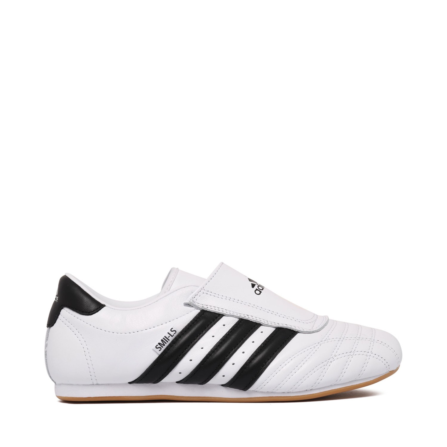 Adidas White and Black Taekwondo Sneakers. White and black calf leather sneakers with gum-rubber sole, branded insole. Logo print to the rear, padded ankle, signature 3-Stripes logo, perforated detailing. Logo print tongue, round toe, slip-on style.