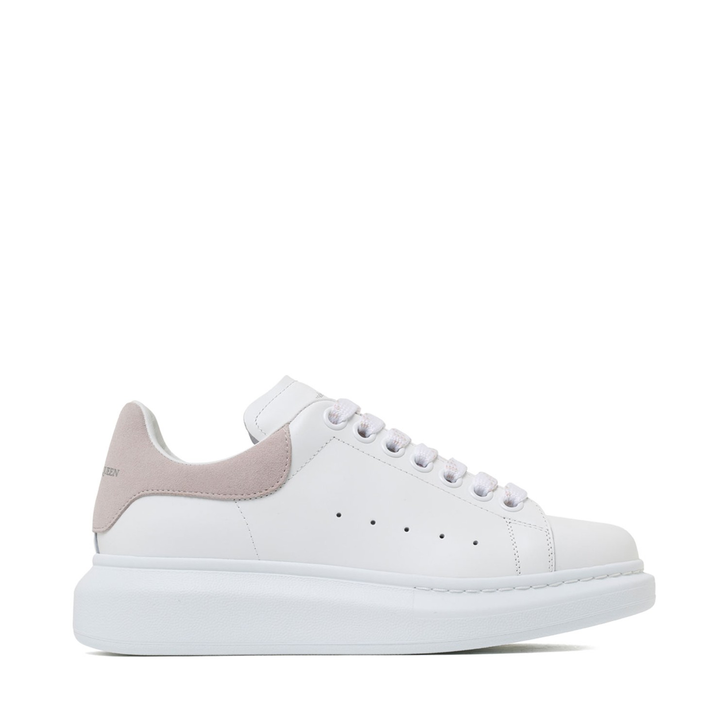 Alexander McQueen White and Light Pink Oversized Sneakers. White and light pink calf leather sneakers, perforated detailing, contrasting heel counter. Logo print tongue, round toe, front lace up fastening. Oversize rubber sole, branded insole.