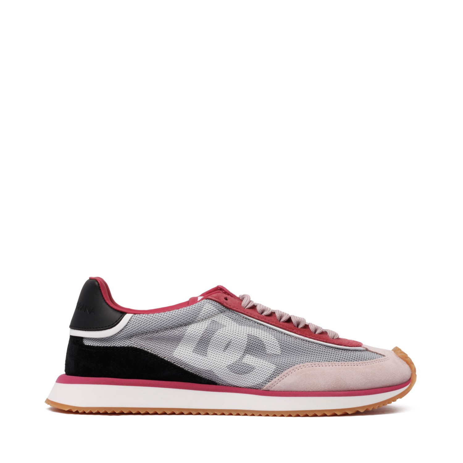 Dolce & Gabbana Aria Sneakers. Light pink and multicolour panelled design sneakers, mesh and suede panelling, leather trim. Round toe, logo print to the side, logo pach at the tongue, branded heel counter. Padded ankle, branded leather insole, flat rubber sole, front lace up fastening.