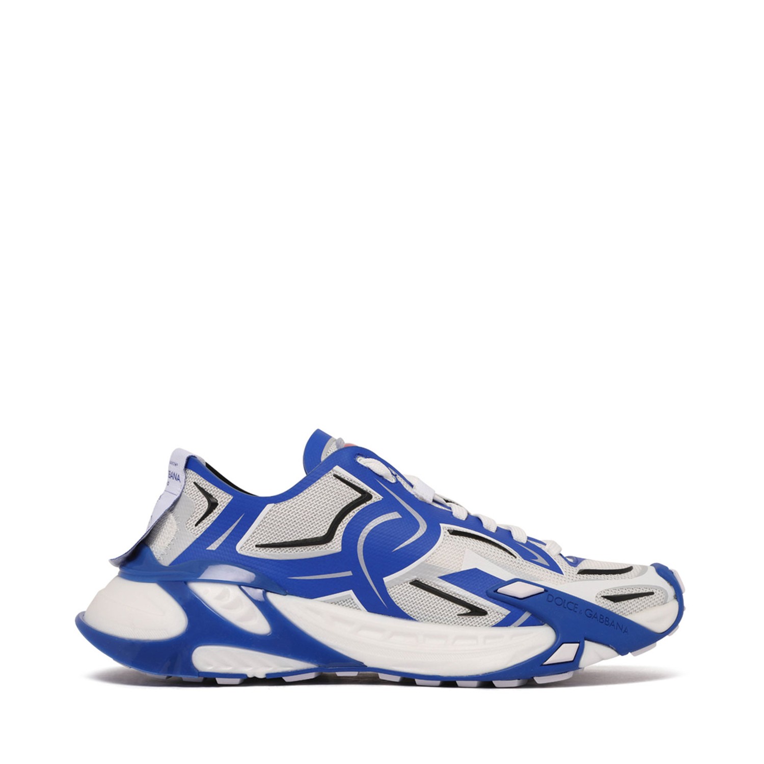 Dolce & Gabbana Blue and White Fast in Maglina Panelled Sneakers. Blue and white panelled design sneakers with round toe, logo patch to the rear, logo patch at the tongue. Front lace-up fastening and chunky rubber sole.