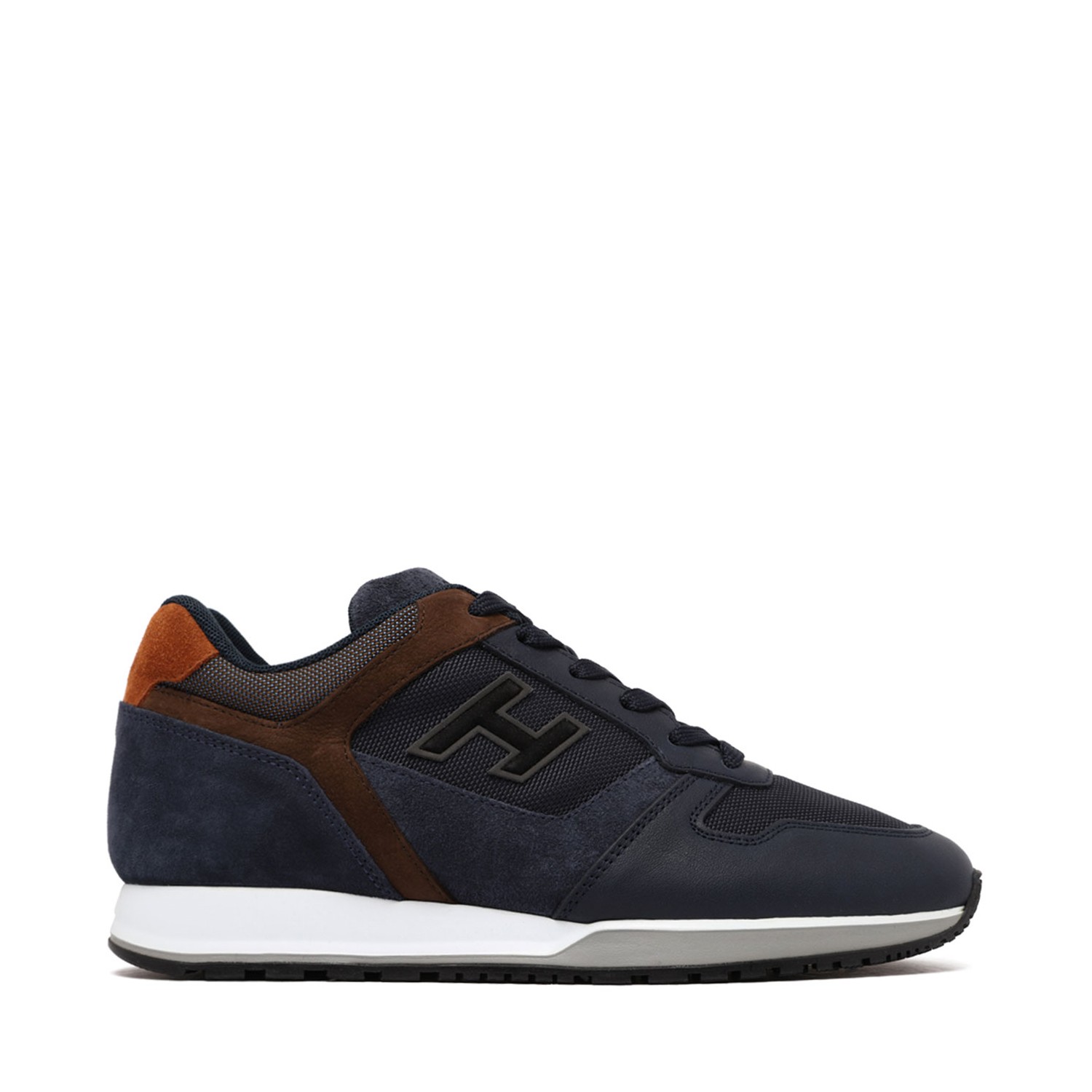 Hogan Blue Panelled-Leather Sneakers. Blue leather panelled design sneakers with front lace-up fastening, flat rubber sole, logo patch to the side.