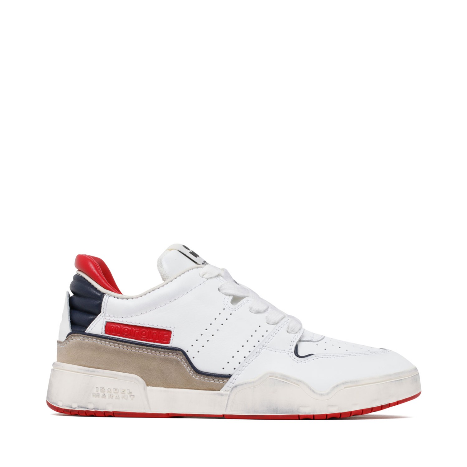 Isabel Marant White Emree Panelled Sneakers. White, blue and red calf leather panelled sneakers, front lace up fastening, logo patch at the tongue, perforated detailing, panelled design, embossed logo to the side, branded insole and flat rubber sole.