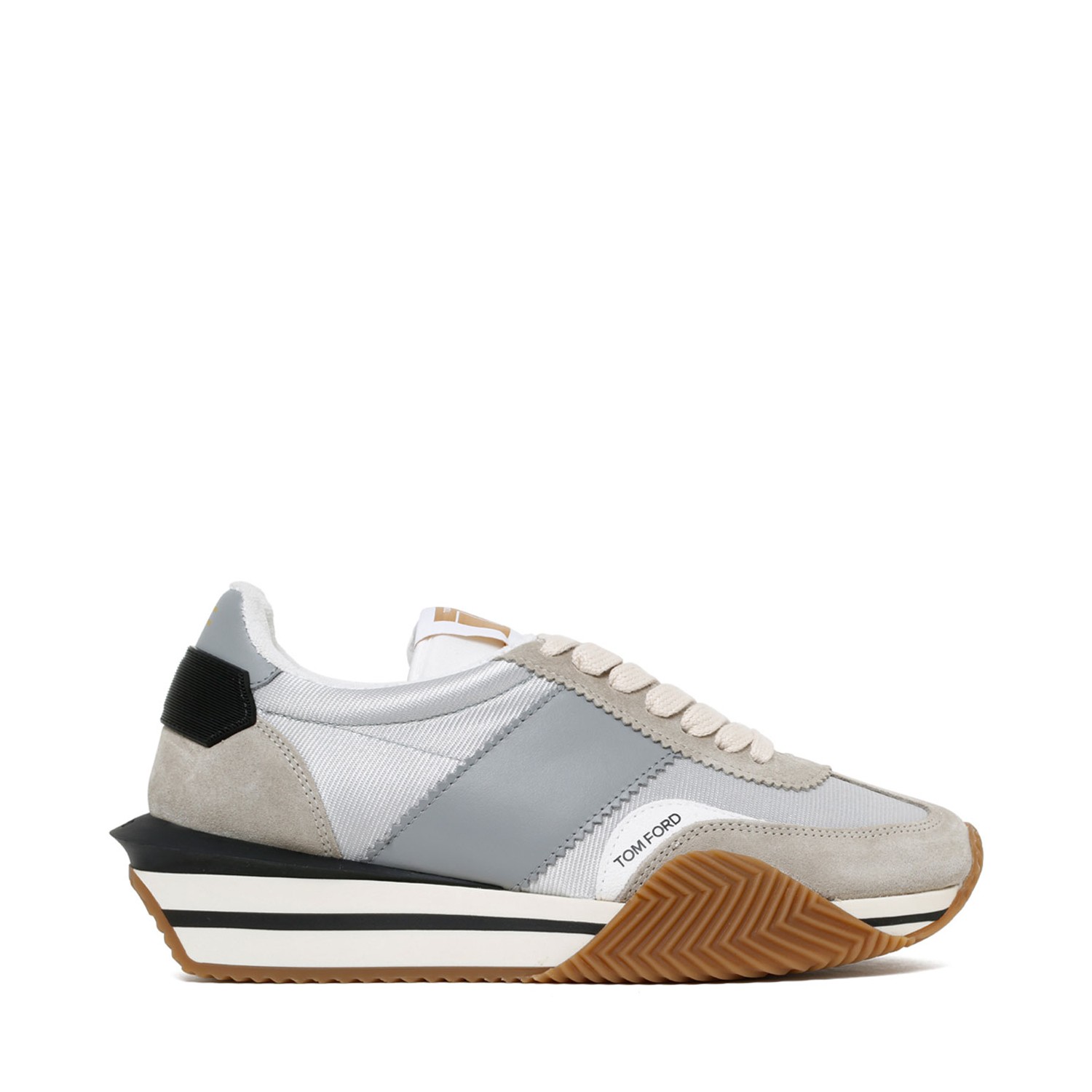 Tom Ford James Chunky Platform Sneakers. Silver tone and taupe brown calf leather sneakers, suede panels, micro mesh panels. Logo patch at the tongue, logo print to the side, contrasting branded heel counter. Front lace up fastening, almond toe, branded insole, platform wedge and chunky rubber sole.