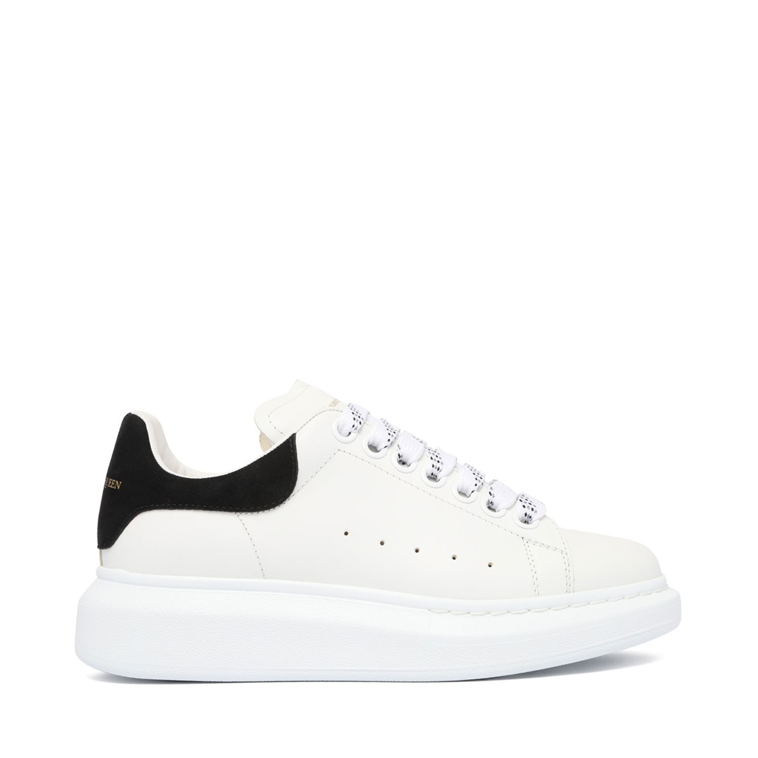 Alexander McQueen White and Black Oversized Sneaker. White smooth calf leather lace-up sneaker with rounded toe and trimmed with black suede heel detail. Large flat laces and McQueen signature on tongue and heel counter. Oversized rubber sole.
