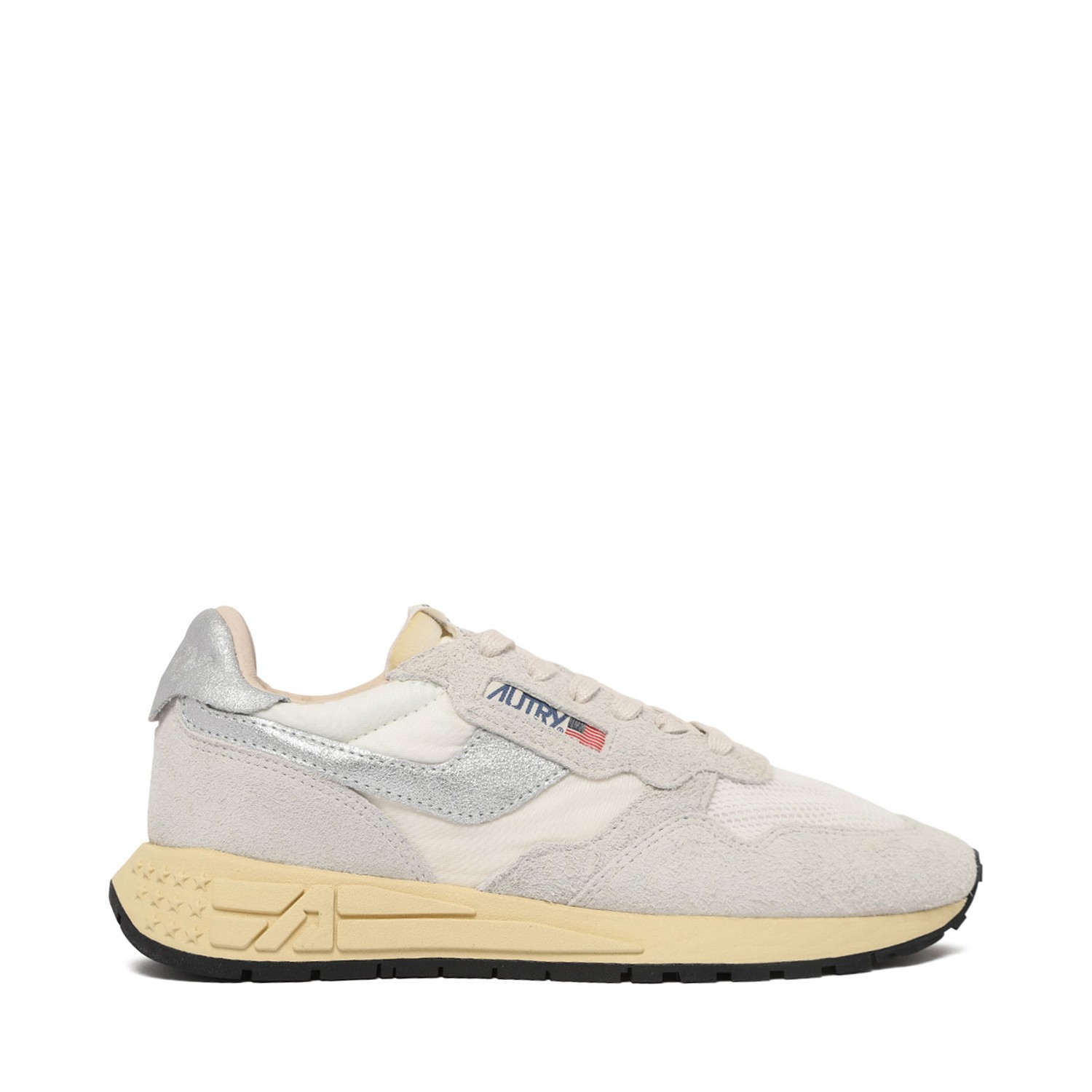 Autry White and Grey Panelled Sneakers. White and grey leather sneakers, front lace-up fastening, logo patch at the tongue, almond toe, rubber sole.