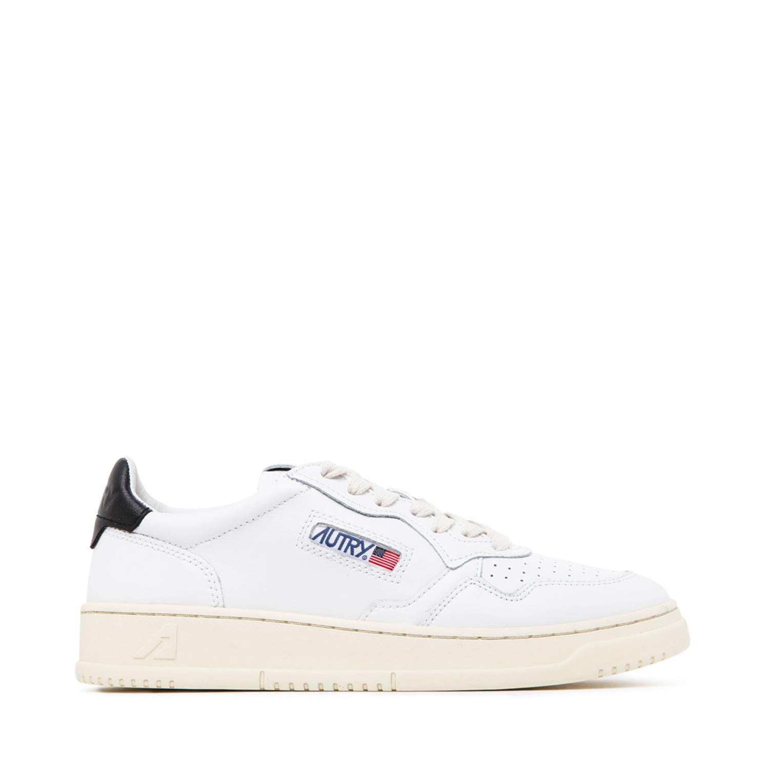 Autry White and Black Leather Low Top Sneakers. White and black leather low top sneakers, logo print to the side, front lace up fastening. Logo patch at the tongue, round toe and rubber sole.