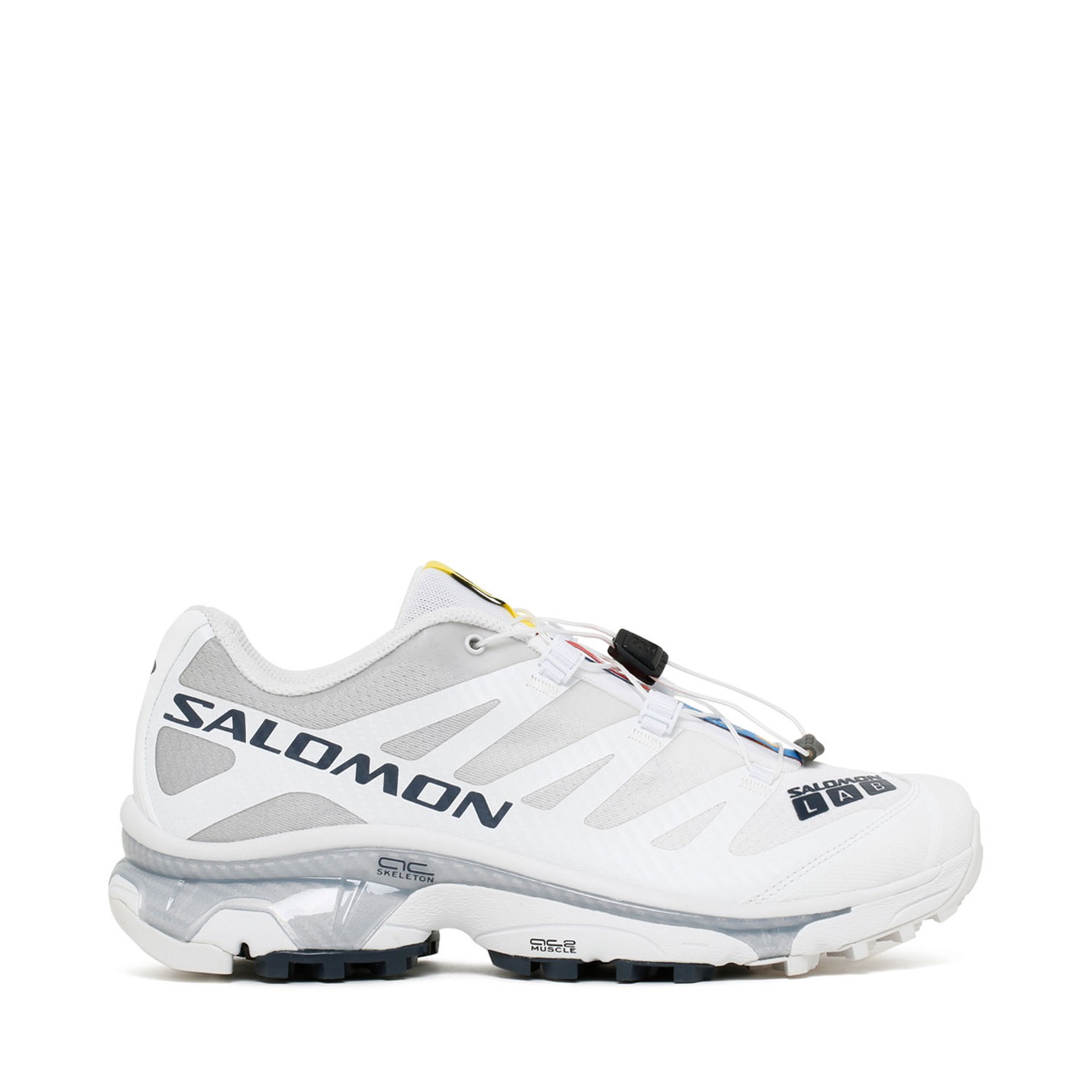 Salomon White XT 4 OG Sneakers. White Xt-4 OG low sneakers with print, white color, black side logo, round toe, front lace-up closure, logo patch on the tongue and striped rubber sole.