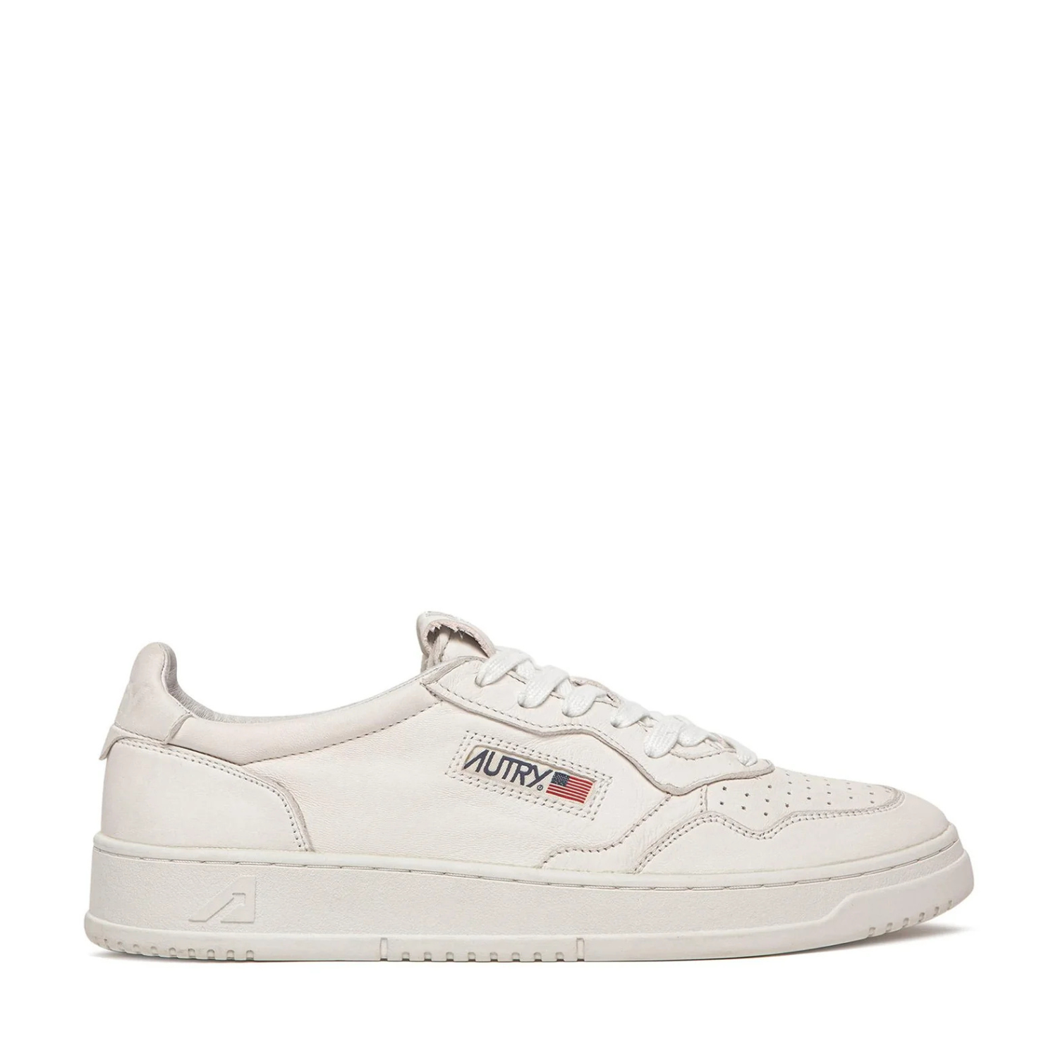 Autry White Leather Medalist Low Sneakers. White washed nappa with rubber sole sneakers, front lacing, flat cotton laces, label with embroidery sewn on the tongue. Padded collar, tone-on-tone leather insert on the back with embossed logo, nappa upper with stitching with multi-layer inserts. Leather and cotton terry lining, 2cm raised leather insole, rubber sole with logo.