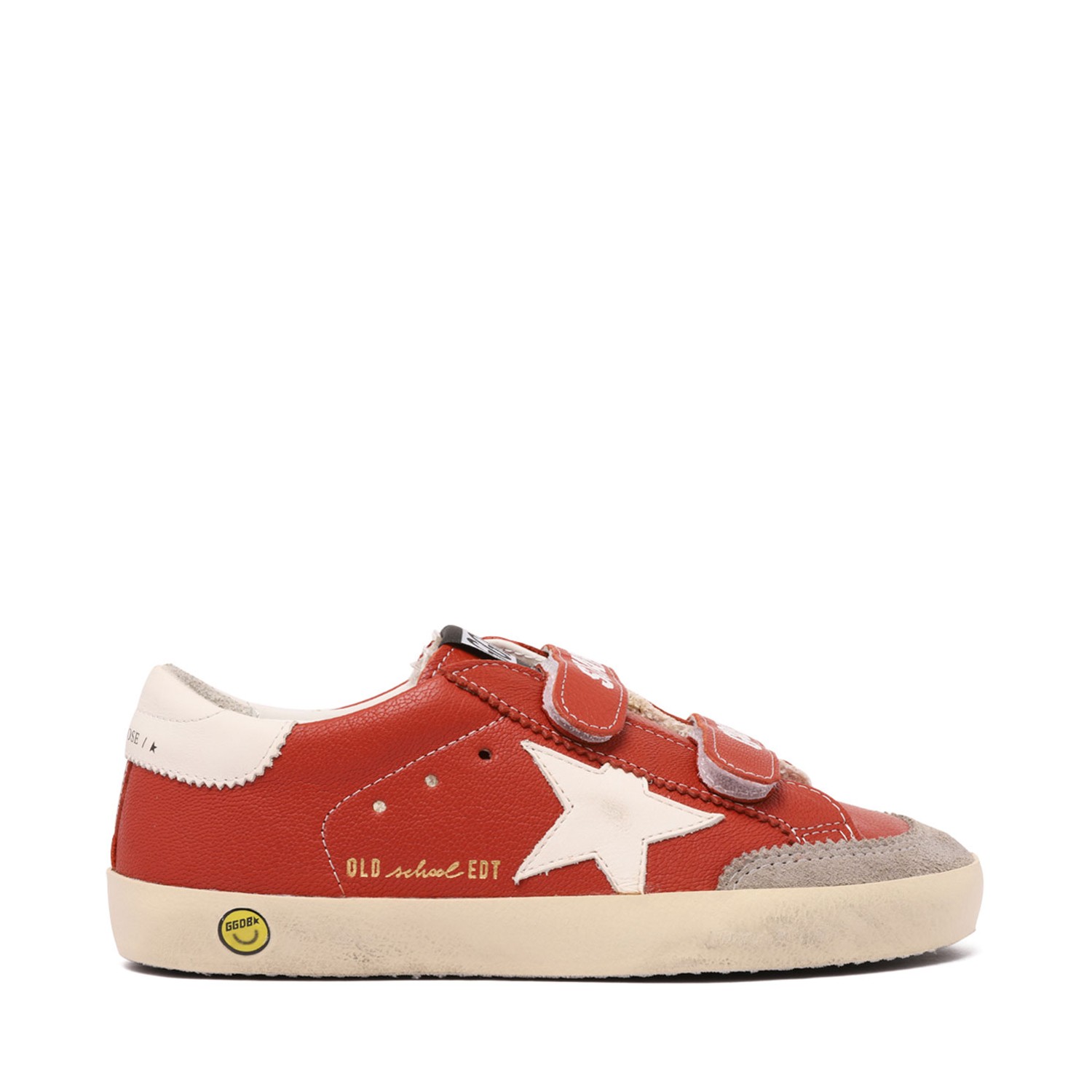 Golden Goose Kids Red Old School Sneakers. Red leather old school sneakers with touch-strap fastening, star motif, logo patch to the tongue. Distressed detailing and contrasting heel counter.