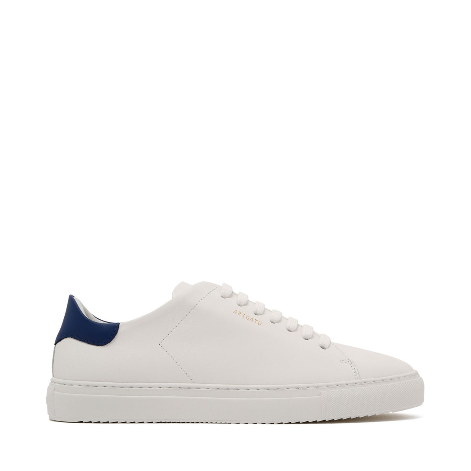 Axel Arigato White and Blue Clean 90 Sneakers. Clean 90 sneakers made of smooth-grained calfskin leather with white upper and blue heel detail. Round toe, gold logo print in the side. Logo insole and flat rubber sole. Lace-up front closure.