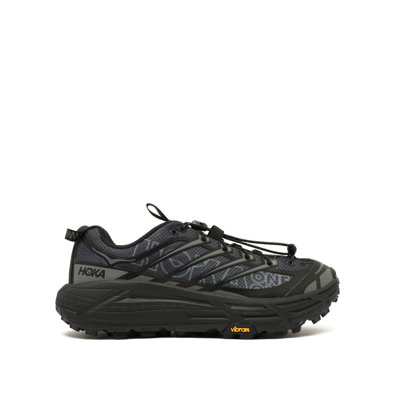 Hoka Black Mafate Three2 Logo Print Sneakers. Black logo print sneakers with lace-up fastening, padded collar and rubber sole.