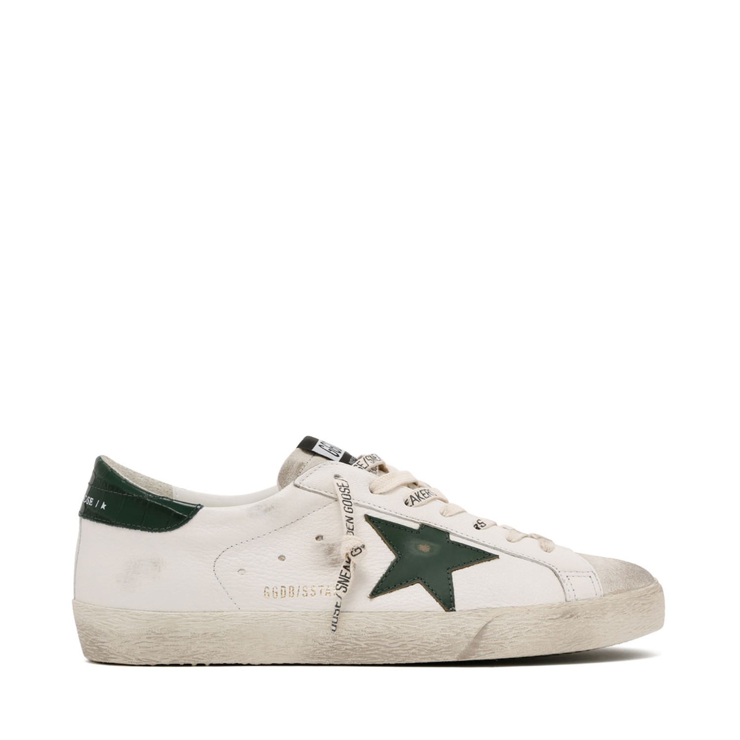 Golden Goose Green Leather Superstar Sneakers. Green leather sneakers with crocodile print leather heel, green suede star, lettering with metal studs and vintage treatment.